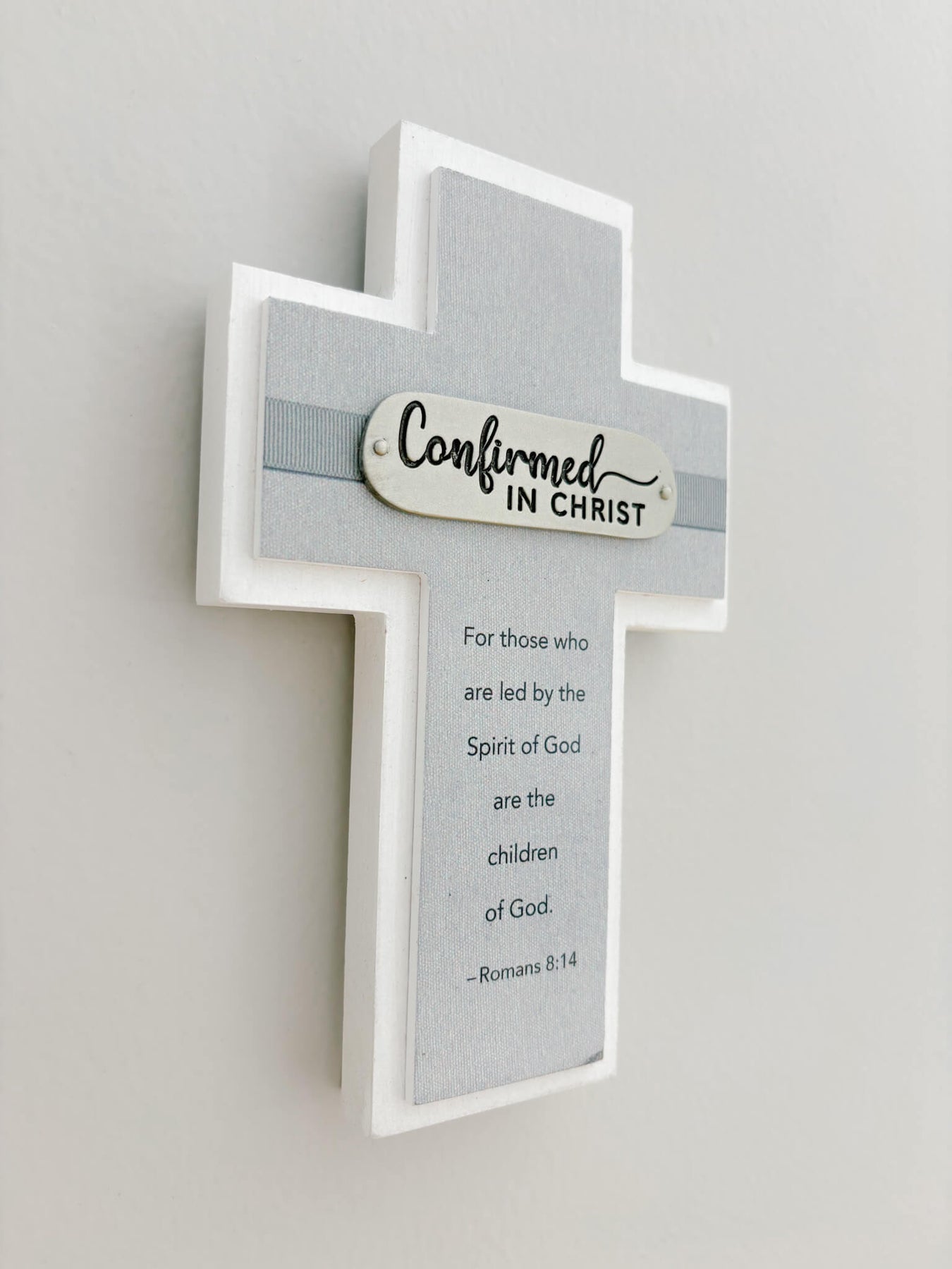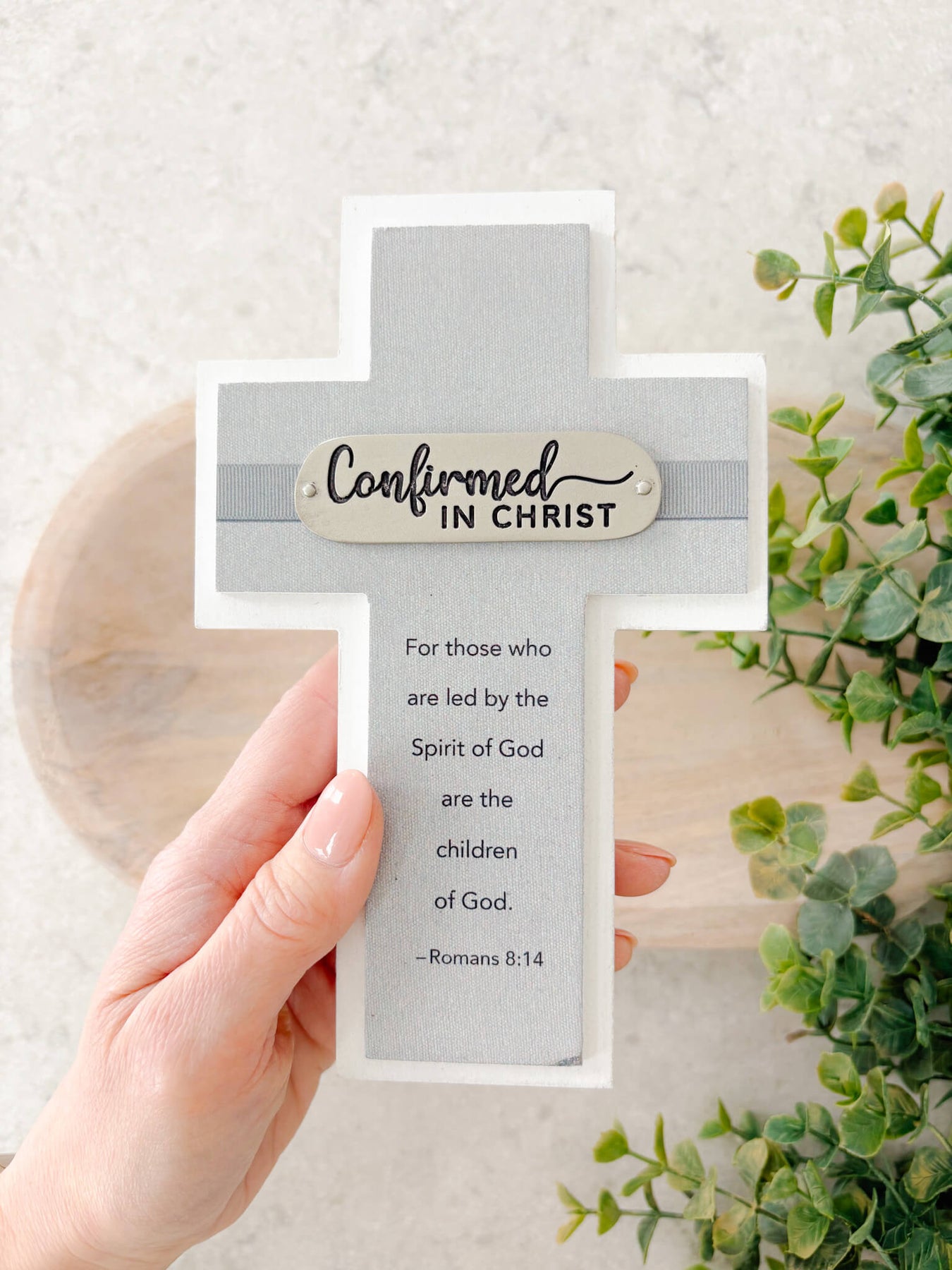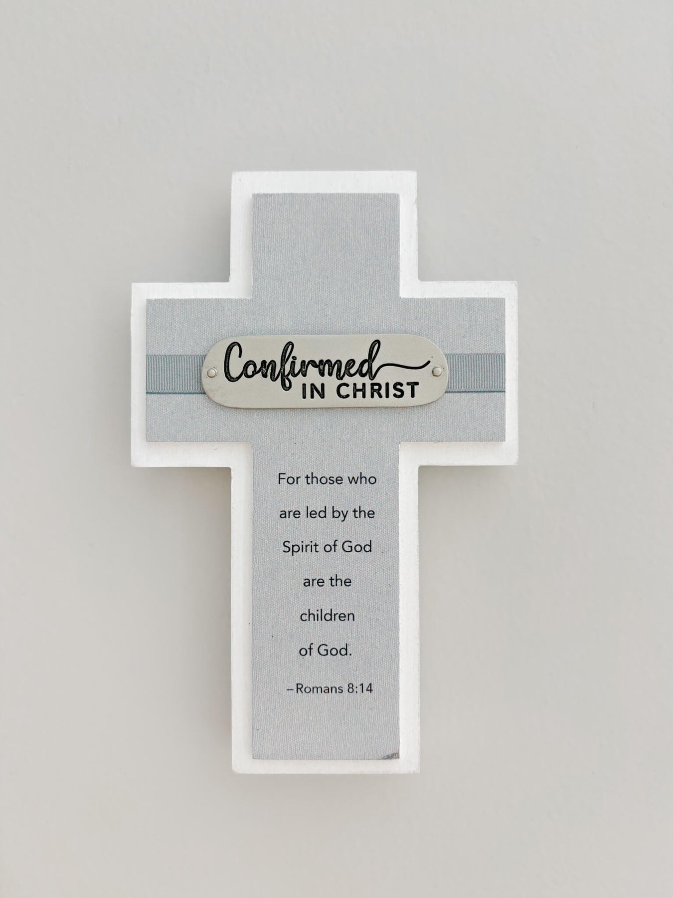 Featuring a silver enamel finished metal accent that reads “Confirmed in Christ,” this piece reflects both reverence and simplicity. The sublimated blessing, drawn from Romans 8:14, gently proclaims: “For those who are led by the Spirit of God are the children of God.” It’s a meaningful verse that speaks to identity, belonging, and the lifelong journey of discipleship.