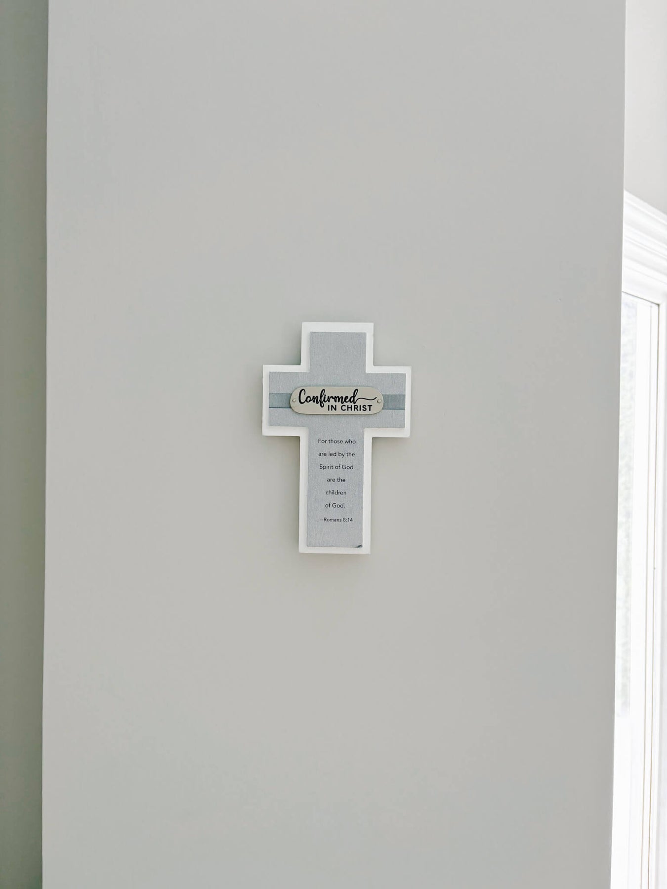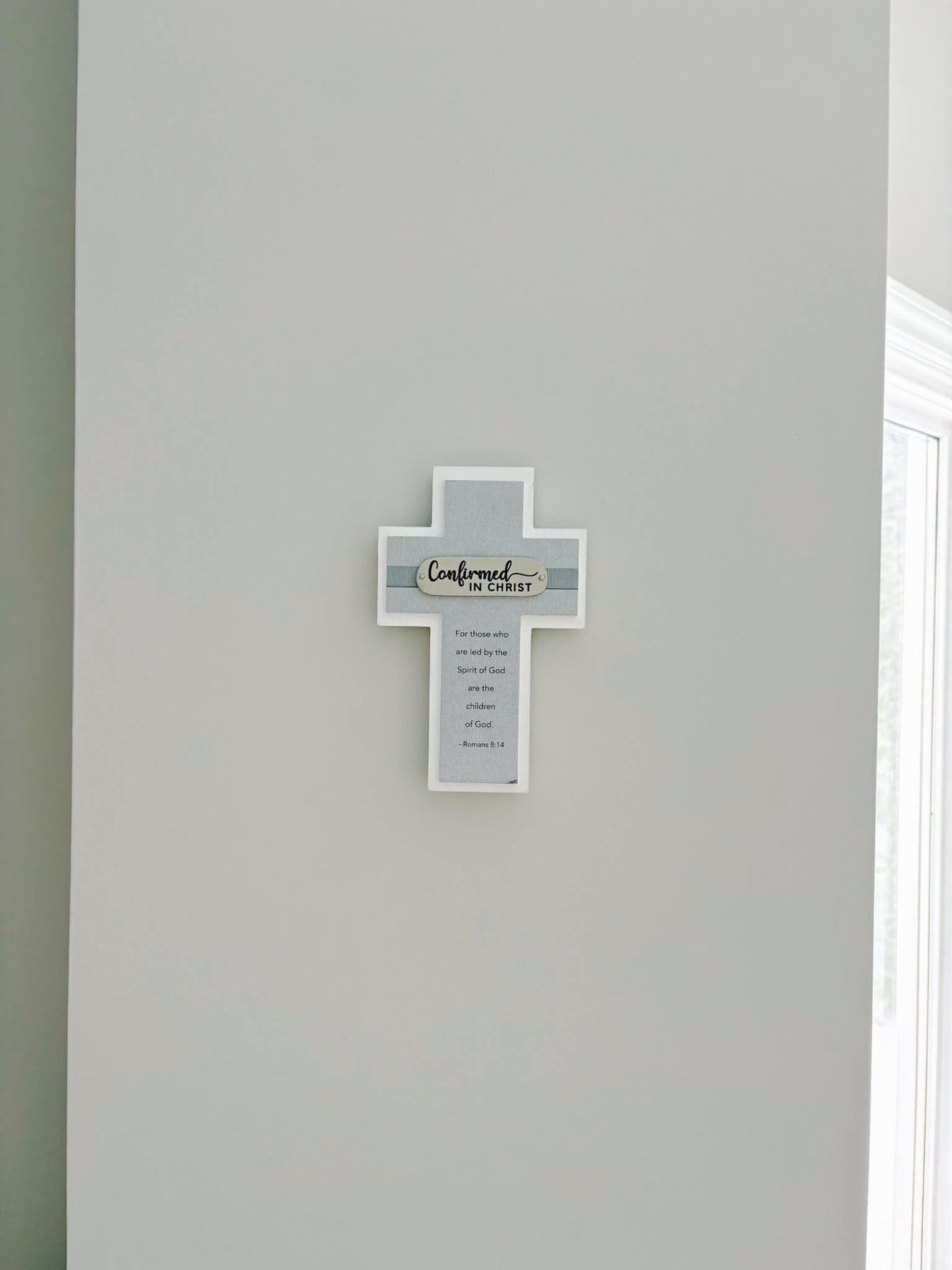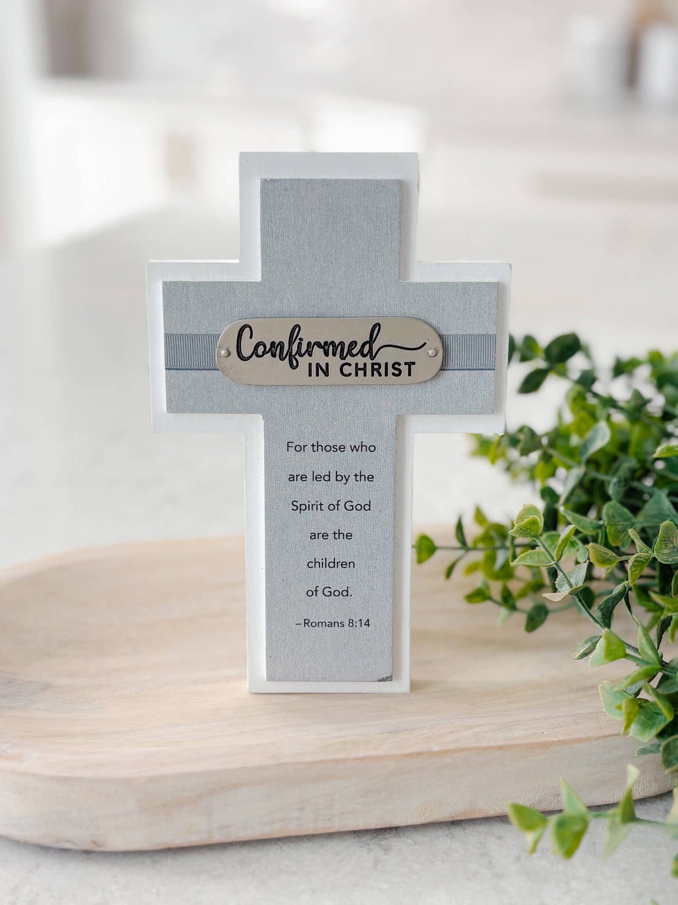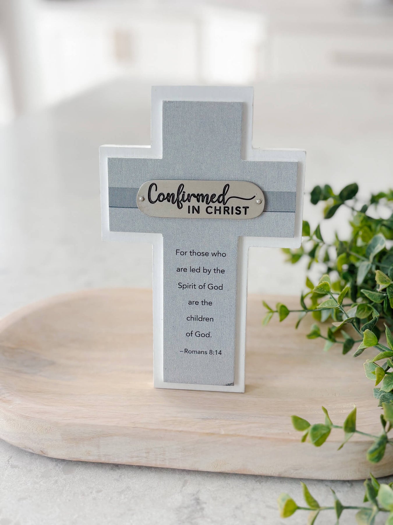 Featuring a silver enamel finished metal accent that reads “Confirmed in Christ,” this piece reflects both reverence and simplicity. The sublimated blessing, drawn from Romans 8:14, gently proclaims: “For those who are led by the Spirit of God are the children of God.” It’s a meaningful verse that speaks to identity, belonging, and the lifelong journey of discipleship.