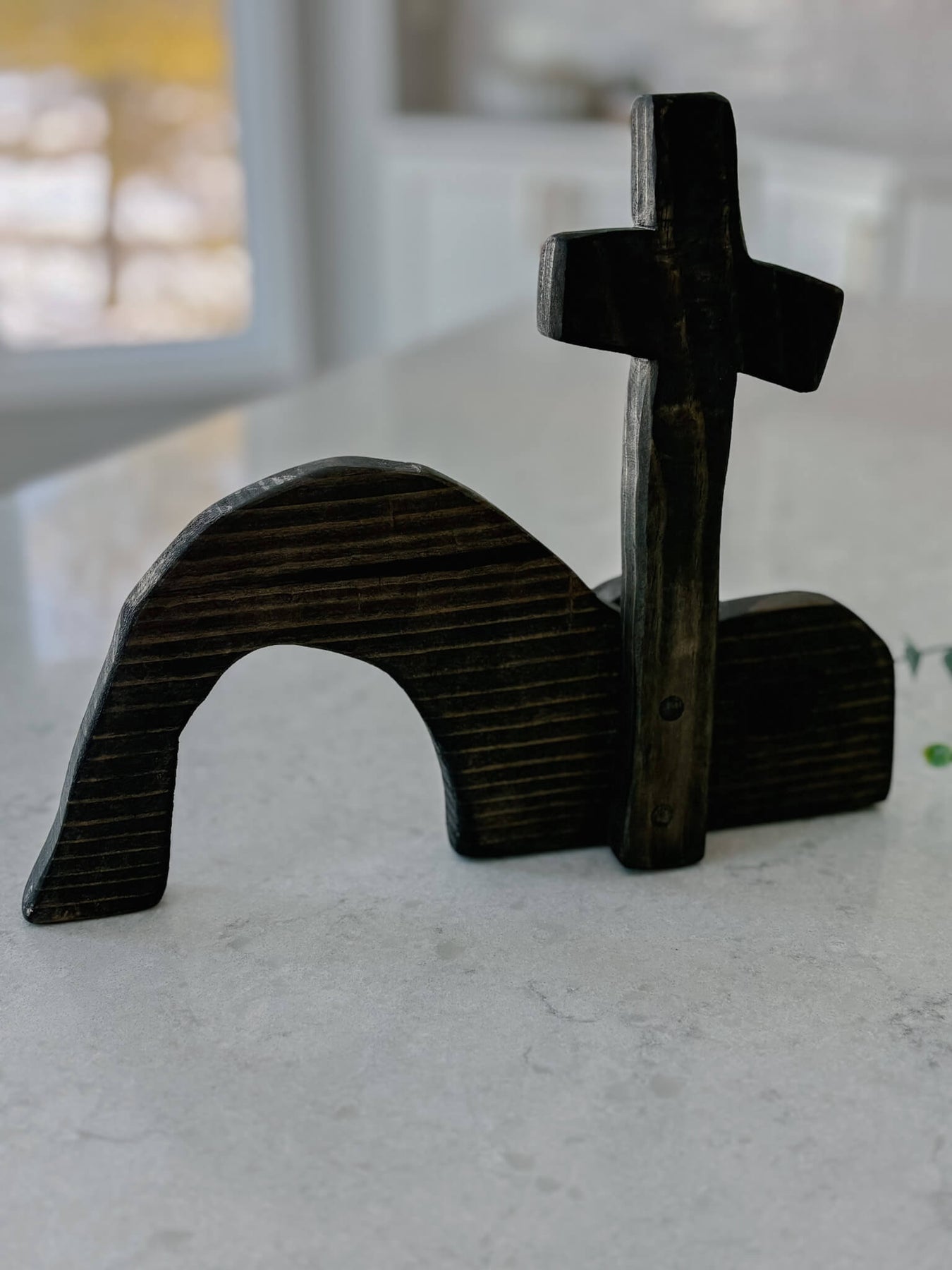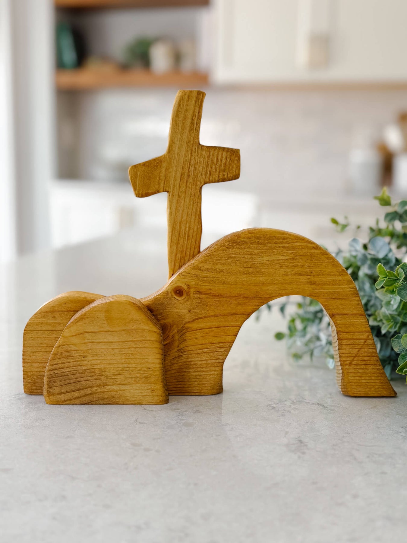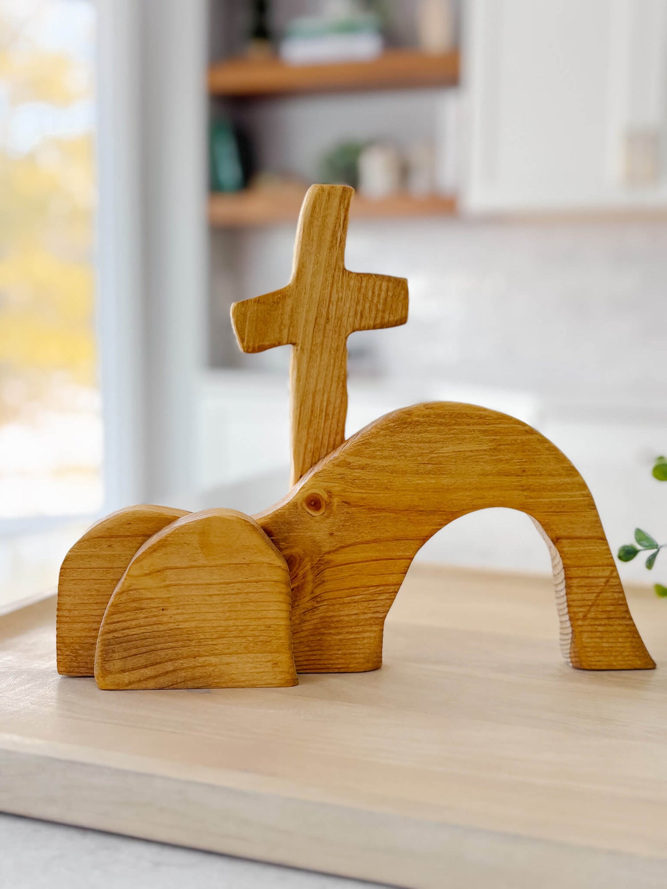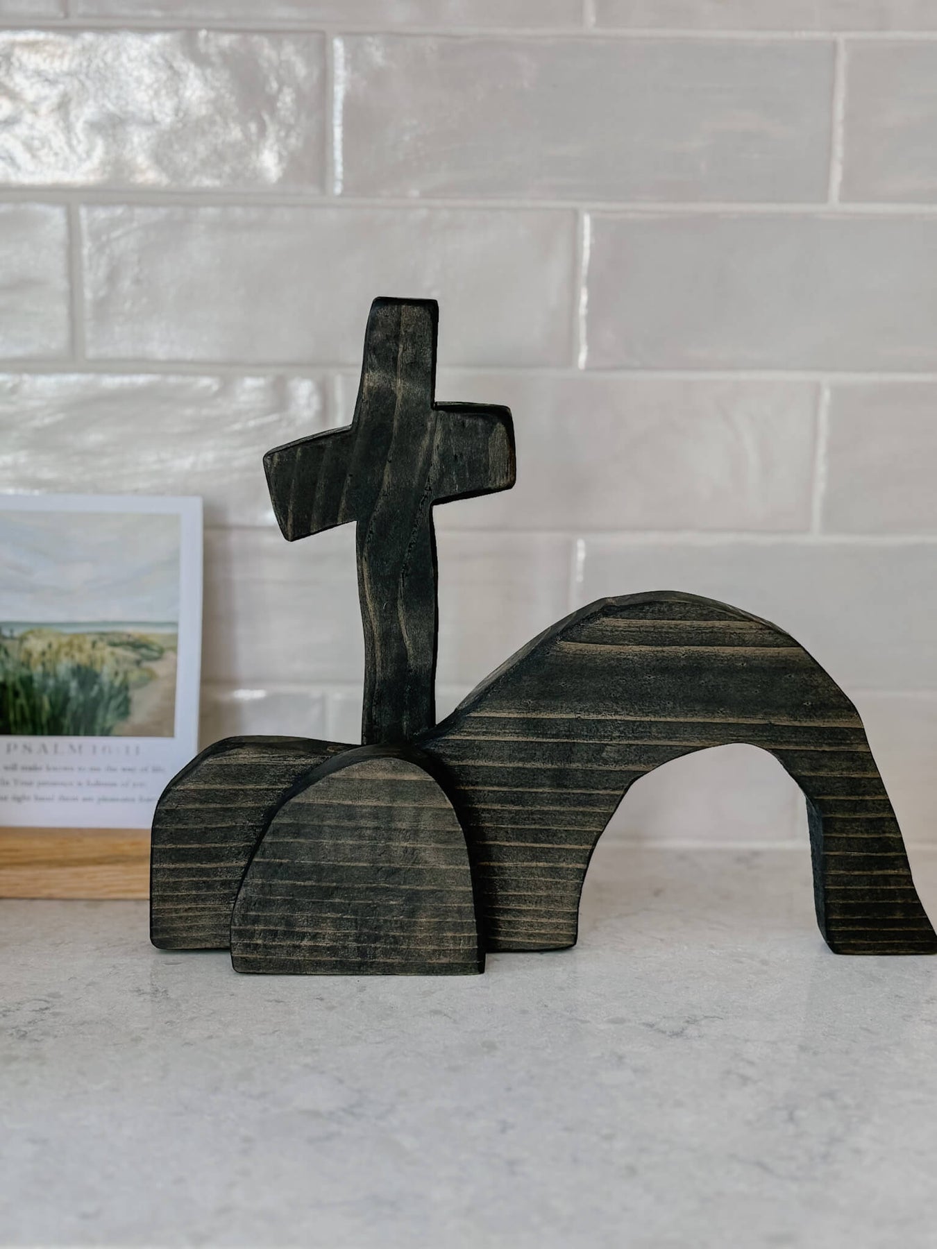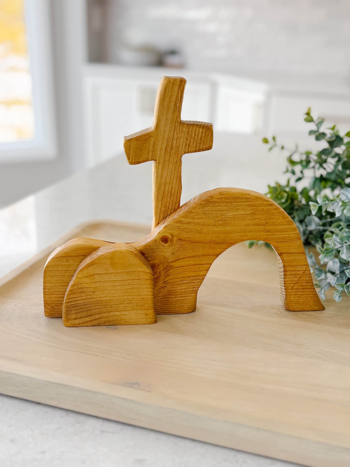 This handcrafted tabletop piece is a simple yet powerful reminder of the Resurrection—an empty tomb beneath the cross, carved in wood and rich with meaning. Its minimal form invites reflection, anchoring your home in hope and the promise of new life.