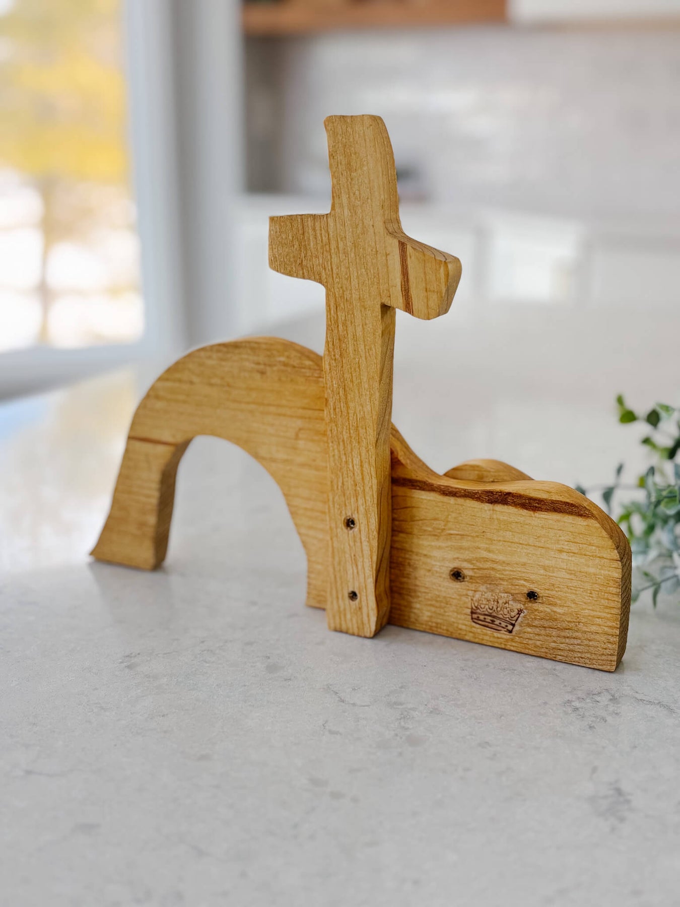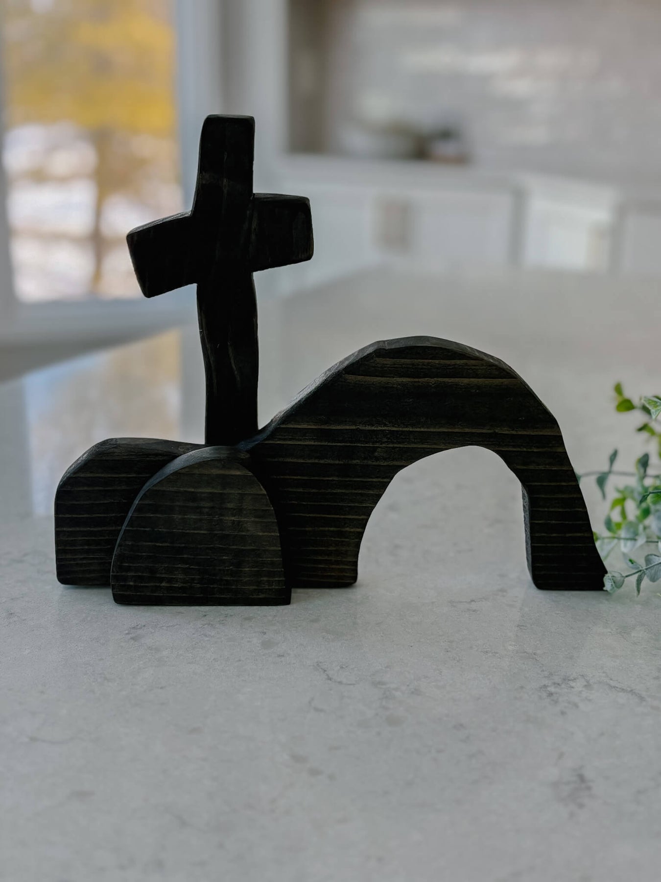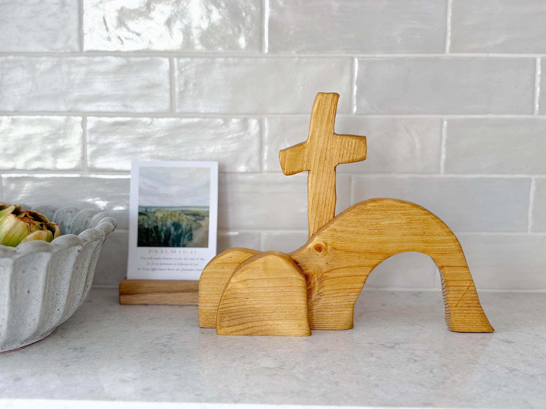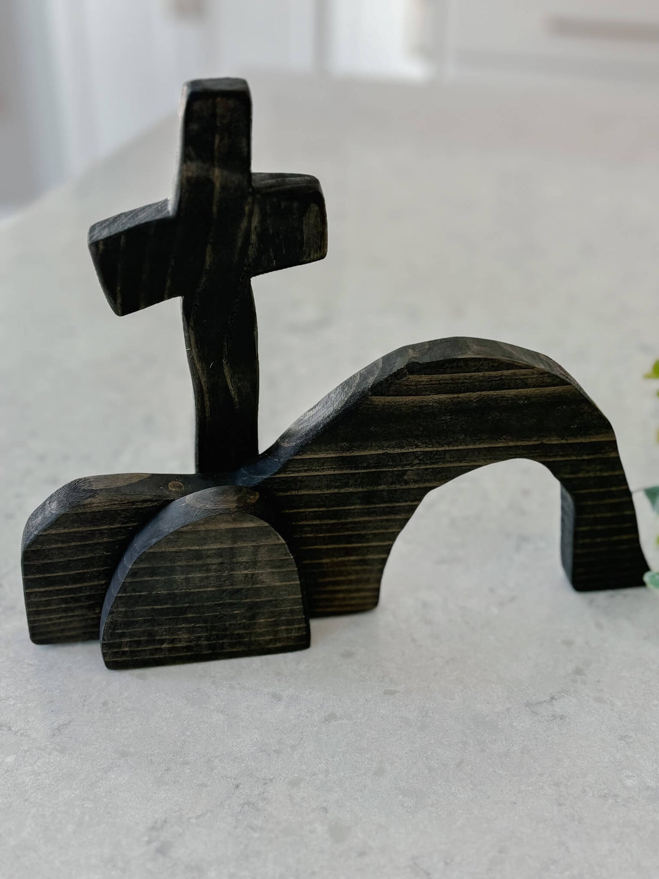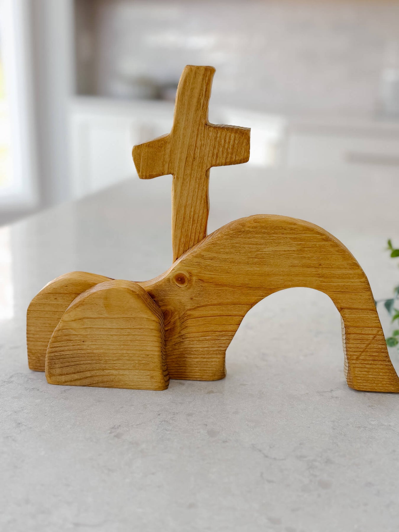This handcrafted tabletop piece is a simple yet powerful reminder of the Resurrection—an empty tomb beneath the cross, carved in wood and rich with meaning. Its minimal form invites reflection, anchoring your home in hope and the promise of new life.