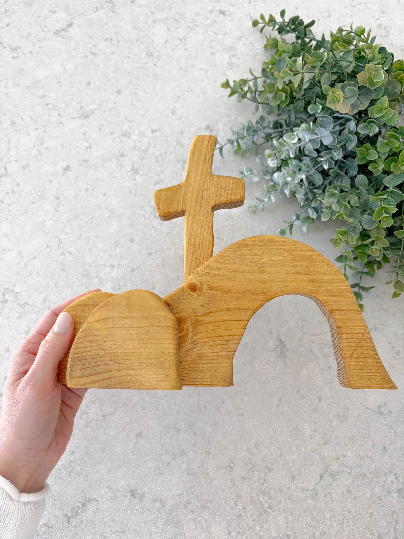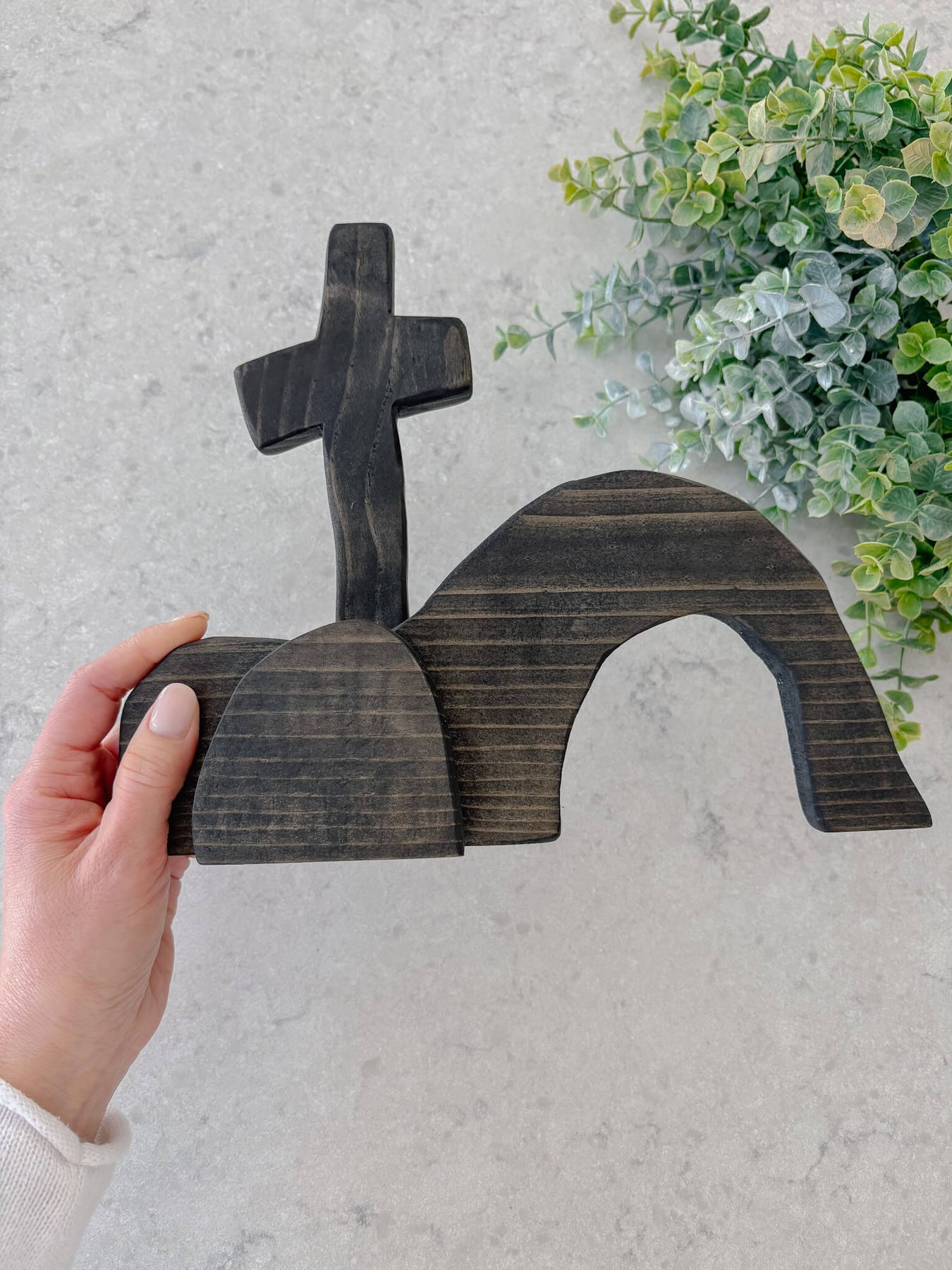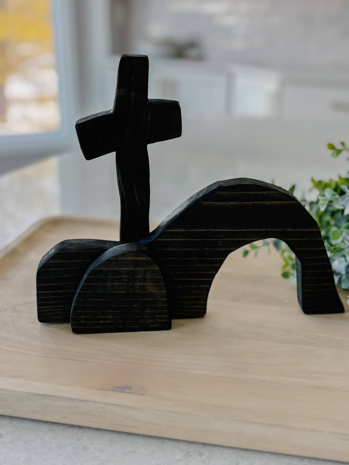 Designed to rest beautifully on a shelf, mantel, or tabletop, this decor integrates seamlessly into your home, whether during the Easter season or all year long as a statement of faith. Available in Natural and Light Black, the warm pine wood will vary slightly in color and grain, honoring its handmade nature and making each piece truly one of a kind.