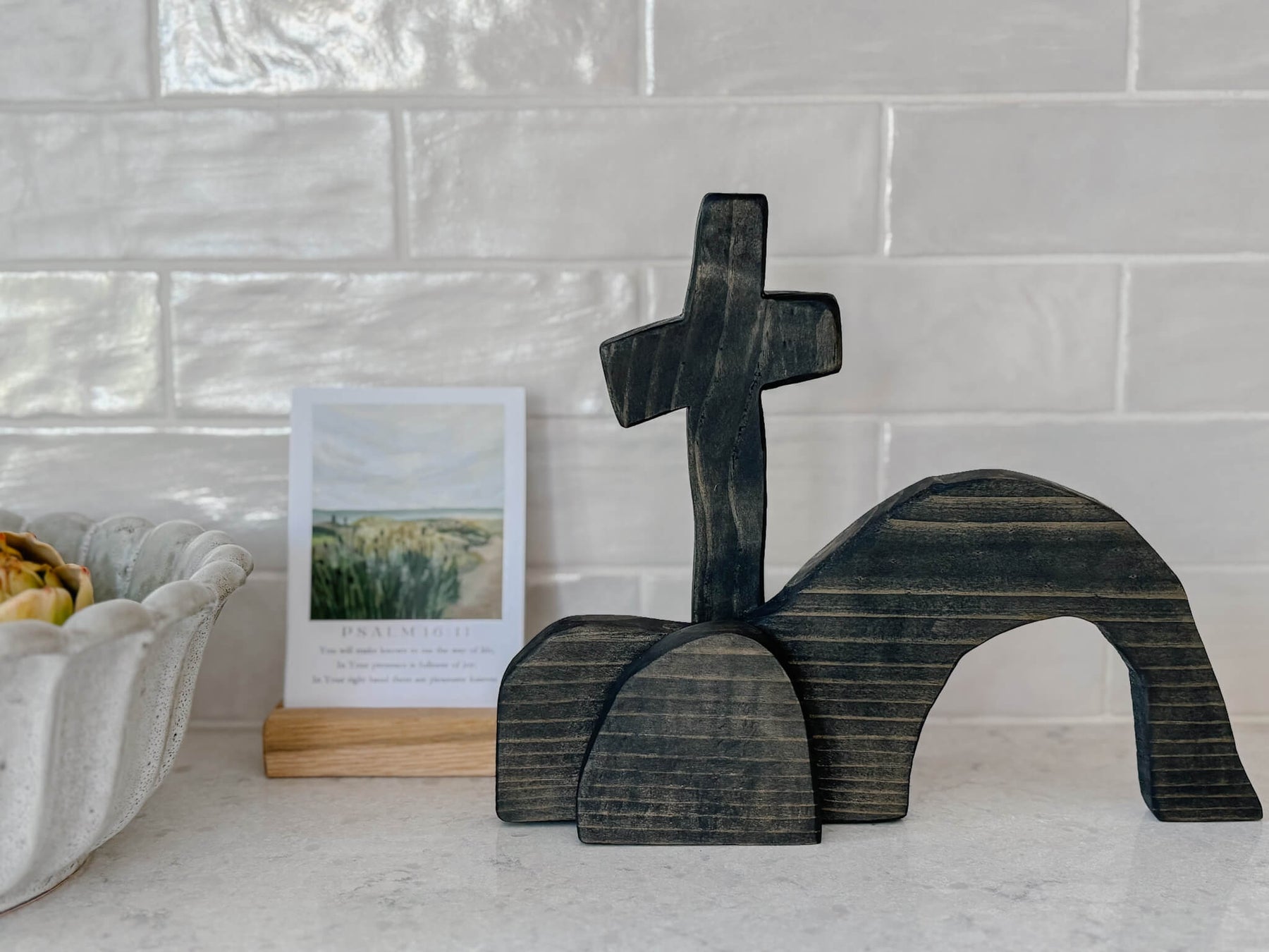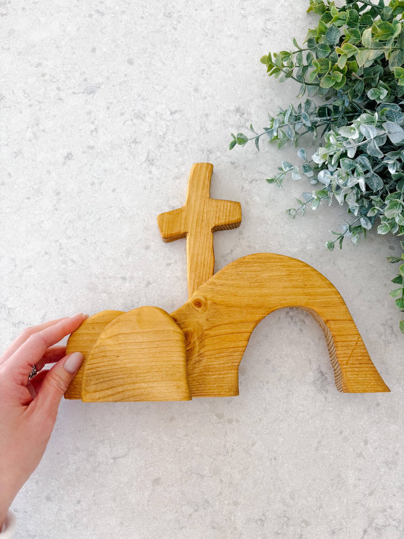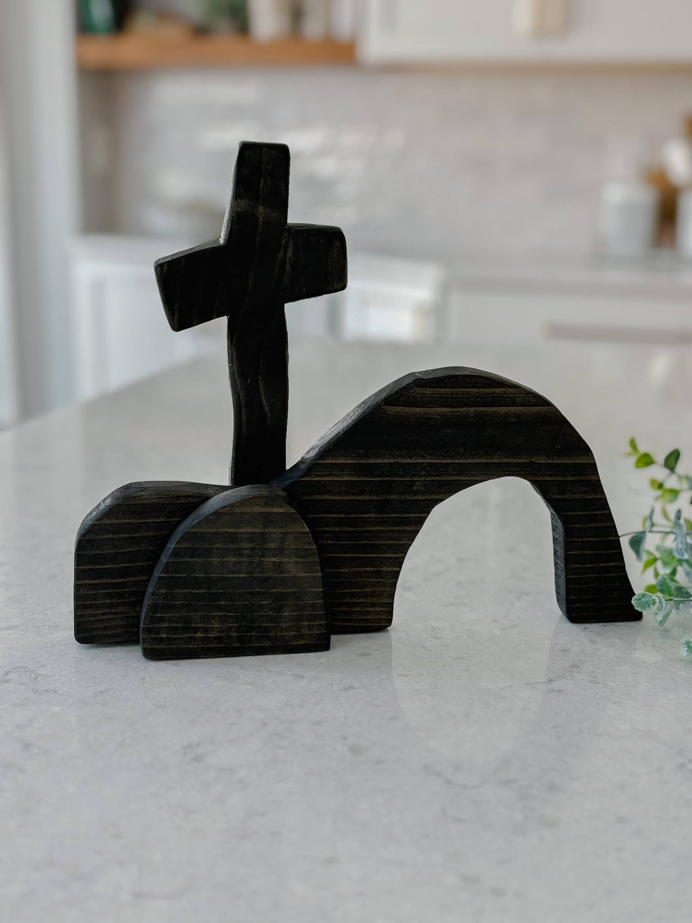 Designed to rest beautifully on a shelf, mantel, or tabletop, this decor integrates seamlessly into your home, whether during the Easter season or all year long as a statement of faith. Available in Natural and Light Black, the warm pine wood will vary slightly in color and grain, honoring its handmade nature and making each piece truly one of a kind.