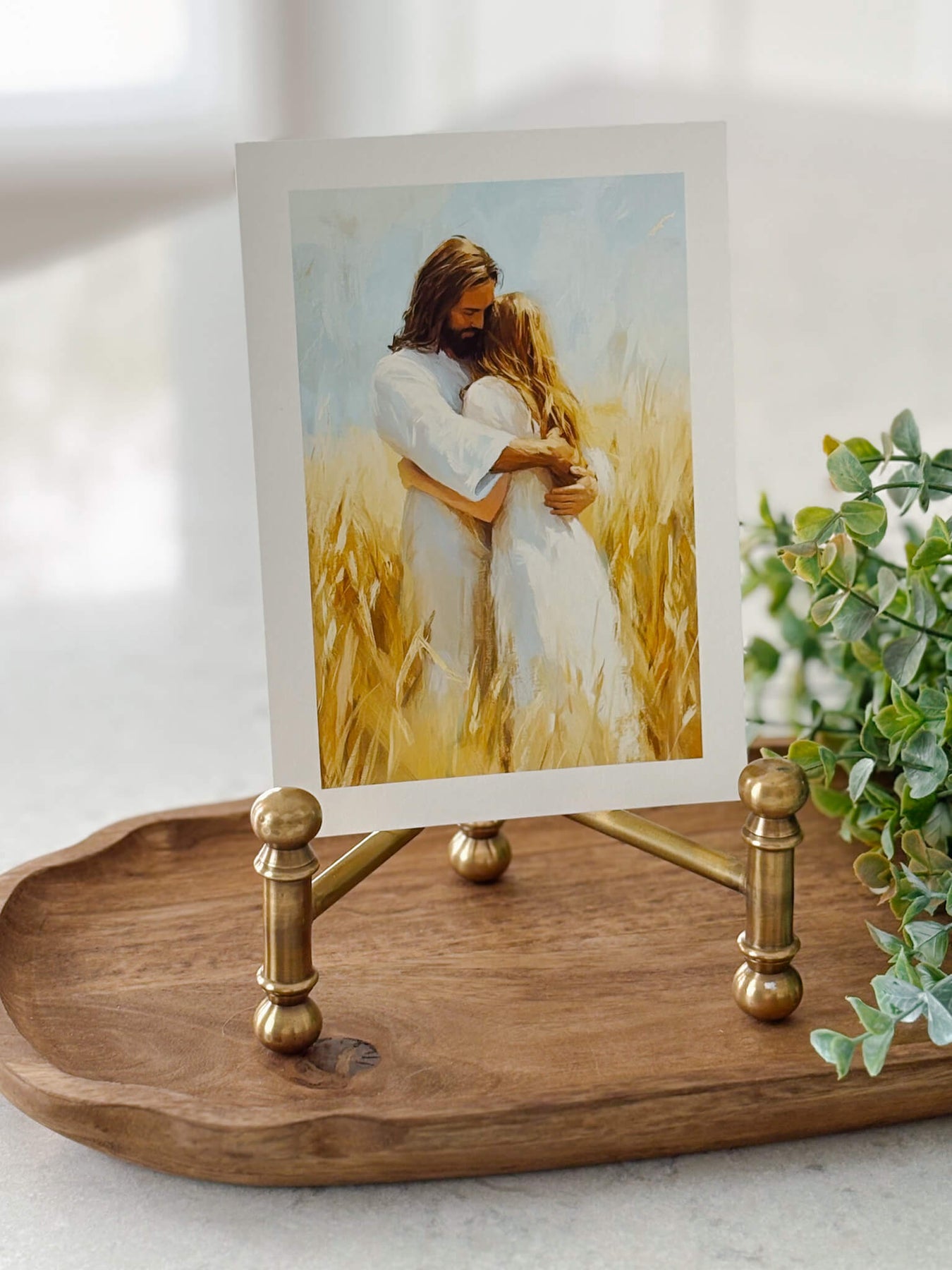 In Healing Embrace, Christ gathers a weary soul into His arms, offering comfort, rest, and the kind of love that restores what the world has worn thin. Set against a field of golden wheat, the scene radiates warmth and tenderness, an invitation to lay down burdens and return to the heart of the One who heals, redeems, and makes all things new. The gentle brushstrokes and luminous color palette reflect the peace we find when we surrender our wounds to Him.