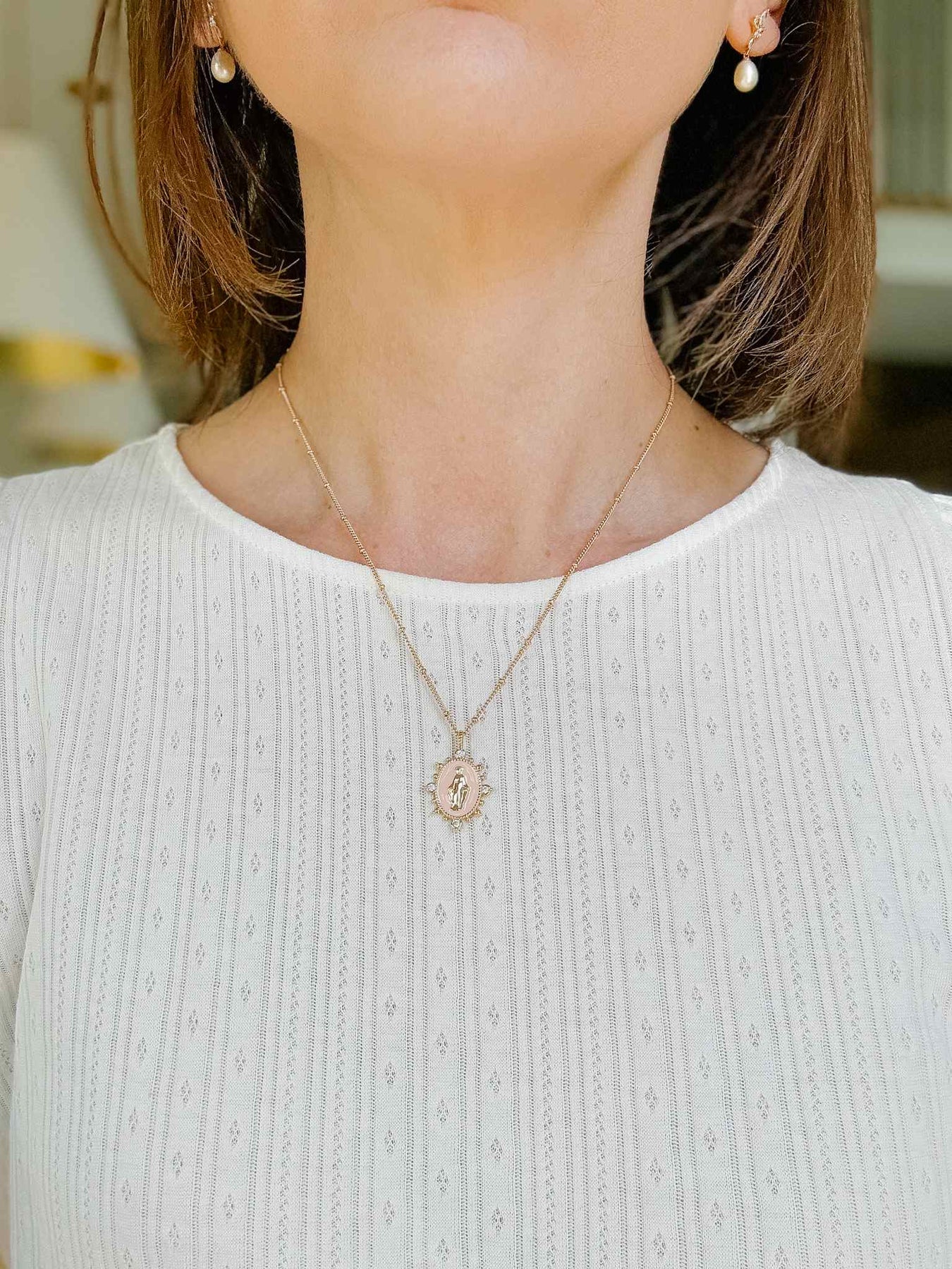 Deepen the faith with the Lady Lourdes Pendant Necklace in Heavenly Pink, an exclusive House of Joppa color. This piece features a dainty ball band highlighting a portrait of the Virgin Mary that is surrounded by ornamental cubic zirconia accents and embellished spike details. Wear this necklace every day and let the Virgin Mary guide your heart to help others. It’s a beautiful reminder of how Mary watches over all of God’s children.