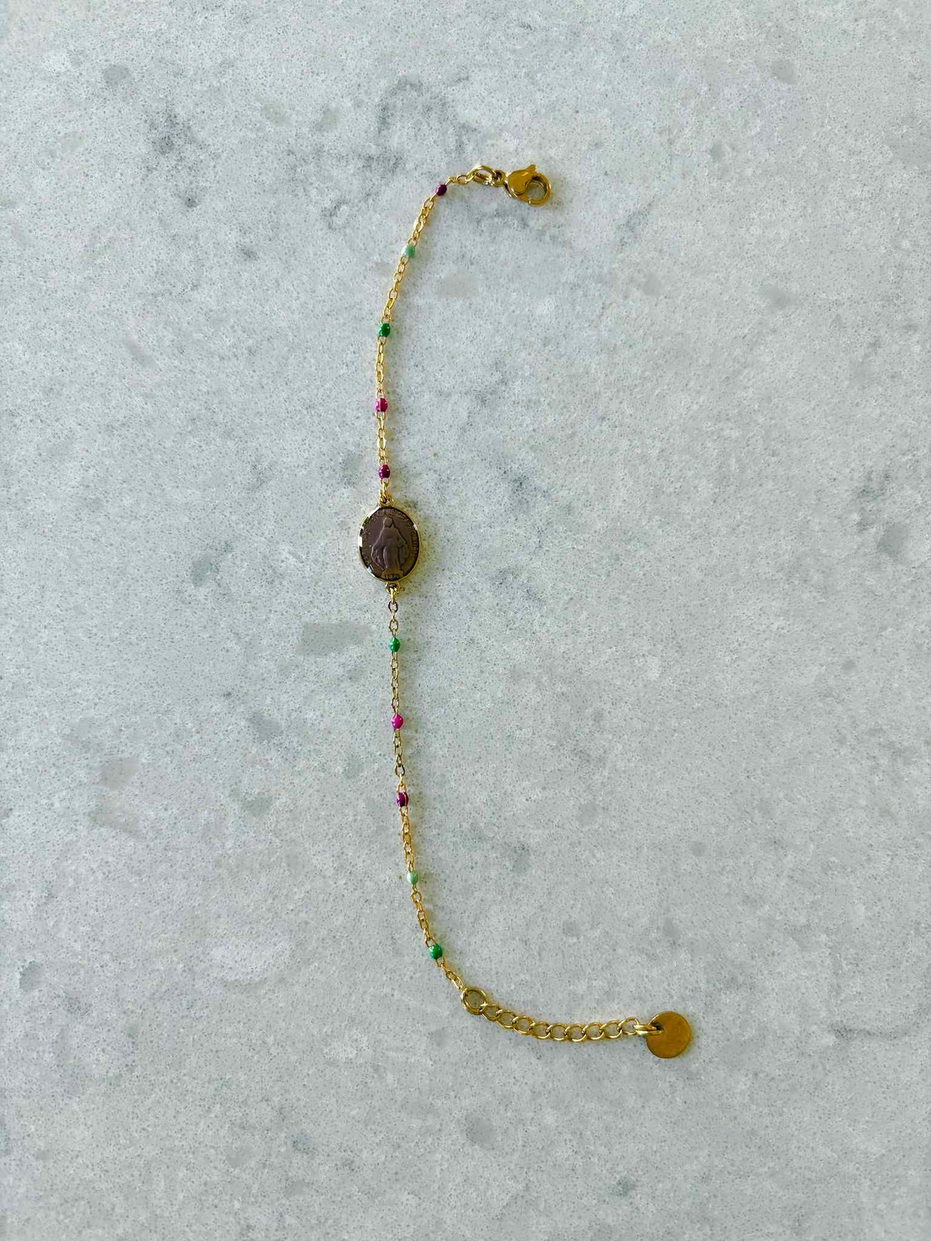 Our Santa Maria Bracelet in Basilic brings a touch of graceful devotion to any outfit. Featuring a plum-colored Miraculous Medal charm with a subtle glazed finish, this bracelet is a modern way to carry Mary’s loving protection wherever you go. Tiny basil-green, blush, and cream accents along the chain add a quiet hint of color and movement, making it feel both refined and playful.