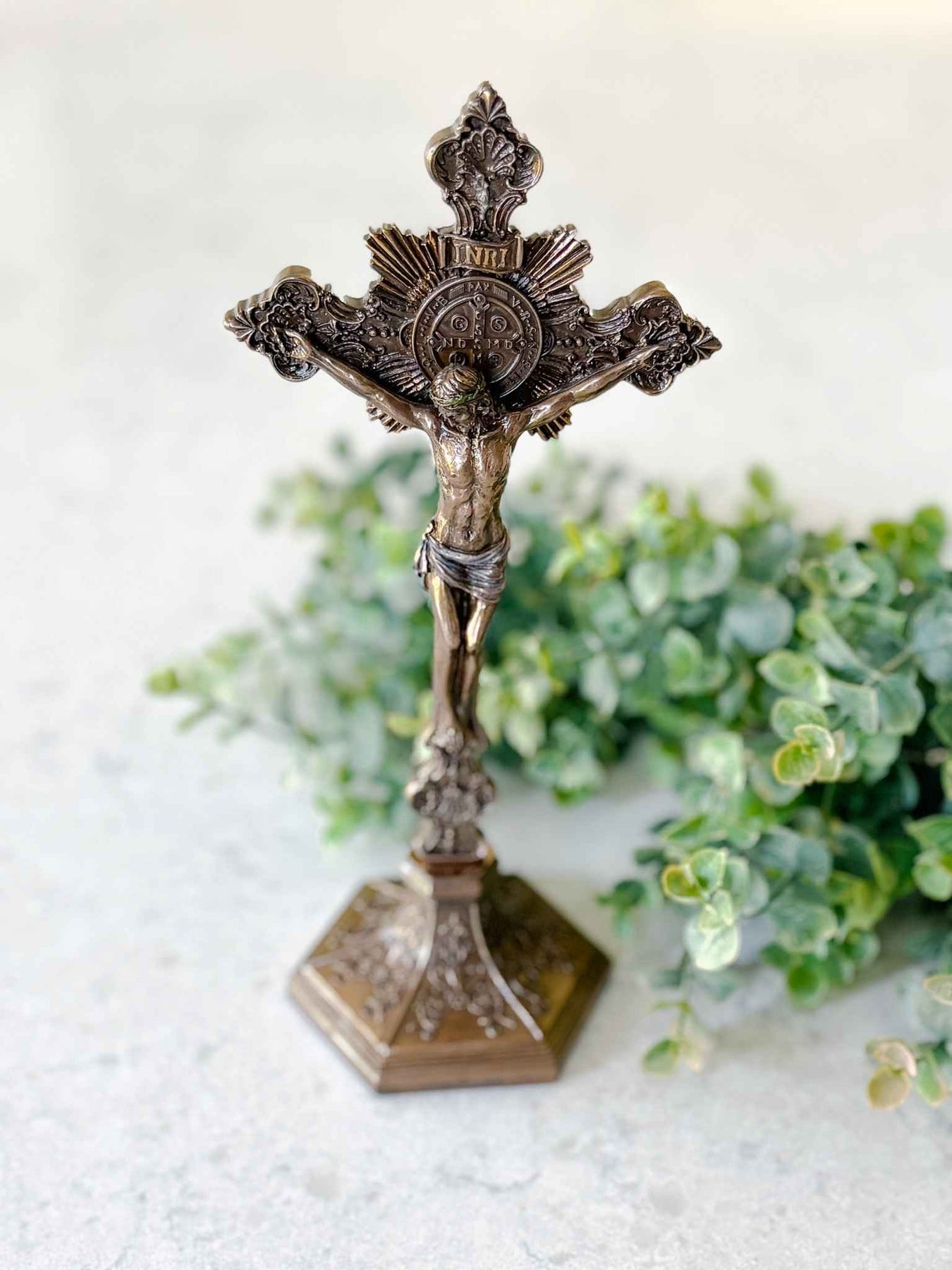 The crucifix features the powerful Medal of St. Benedict behind the corpus of Christ, radiating outward in a symbolic burst of divine light. Its detachable design allows it to rest securely in the ornately carved base as a standing crucifix, or be displayed on the wall as a sacred focal point in your home.