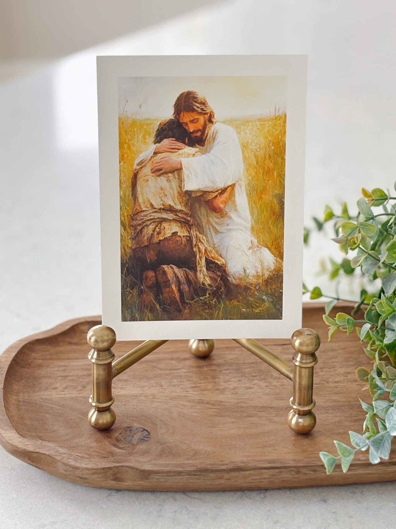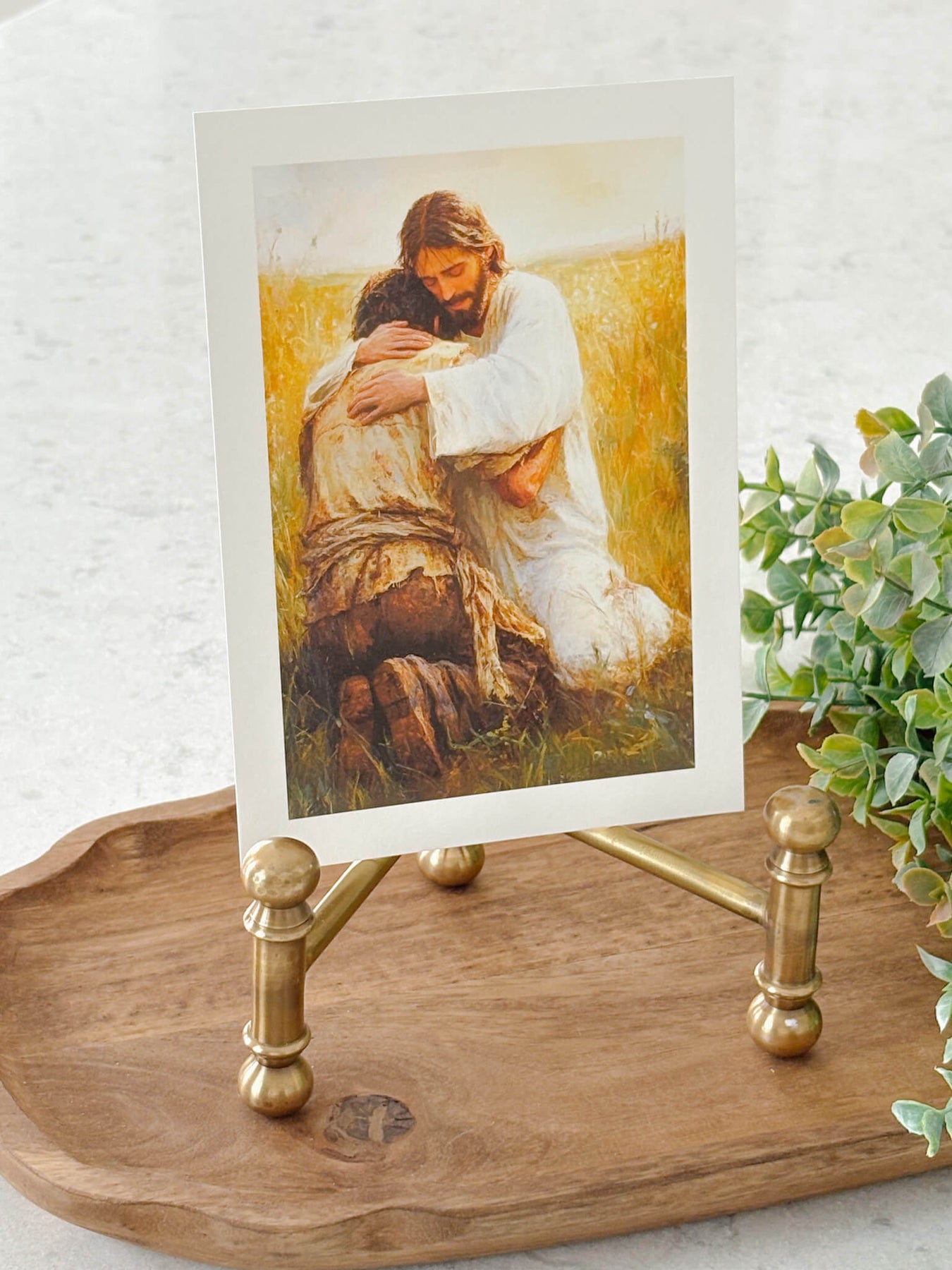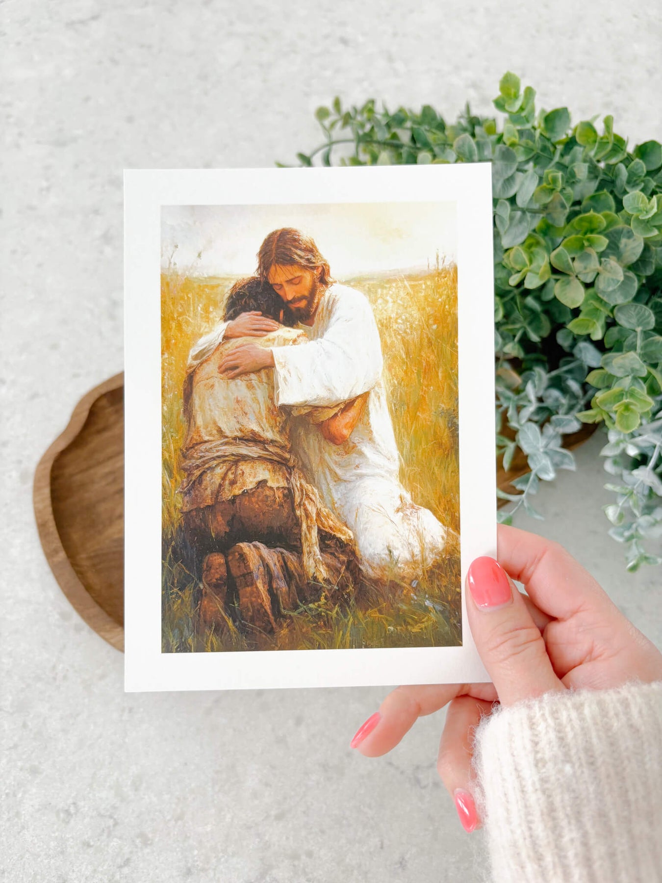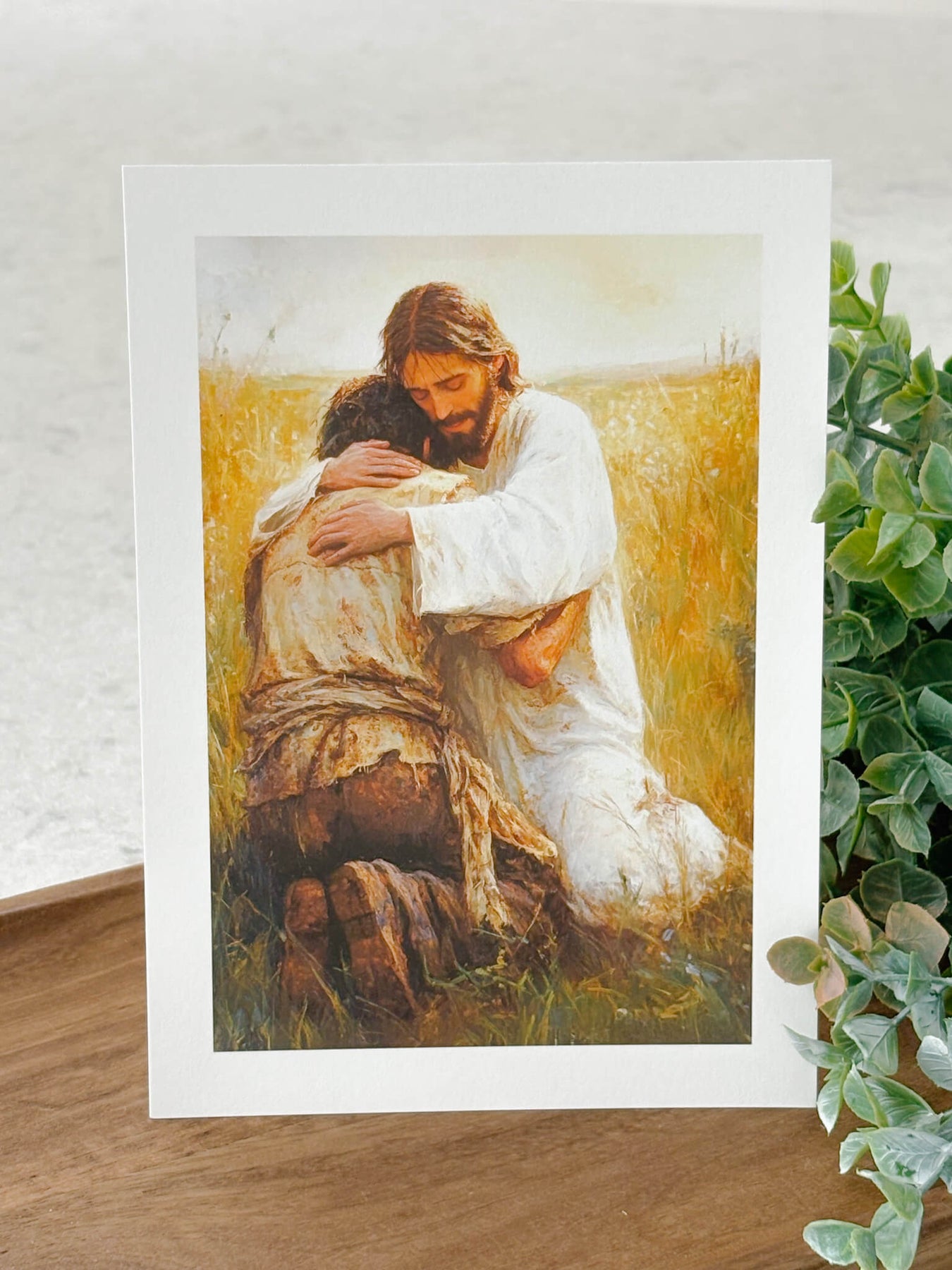 In Prodigal, the moment of return is captured with raw tenderness, Christ kneeling in the grass, arms wrapped around a weary, broken son who has finally come home. The dirt on his clothes, the weight on his shoulders, and the mercy in Christ’s embrace invite us into the heart of the Gospel: no matter how far we wander, the Father runs to meet us with compassion, forgiveness, and joy.