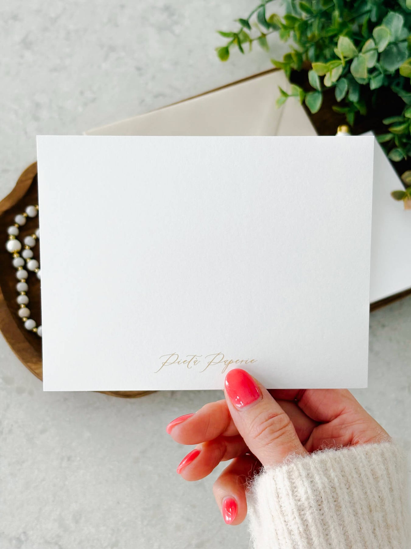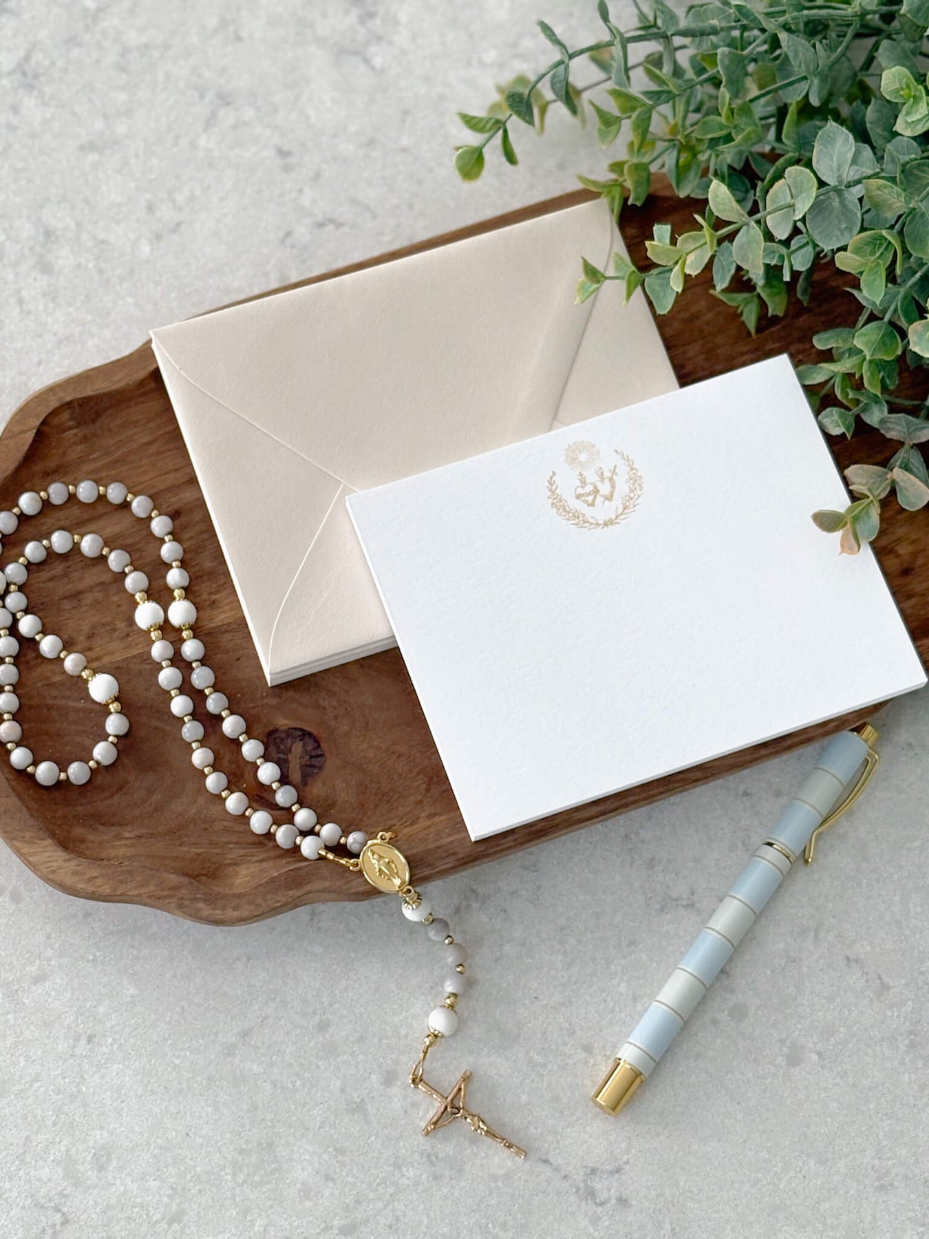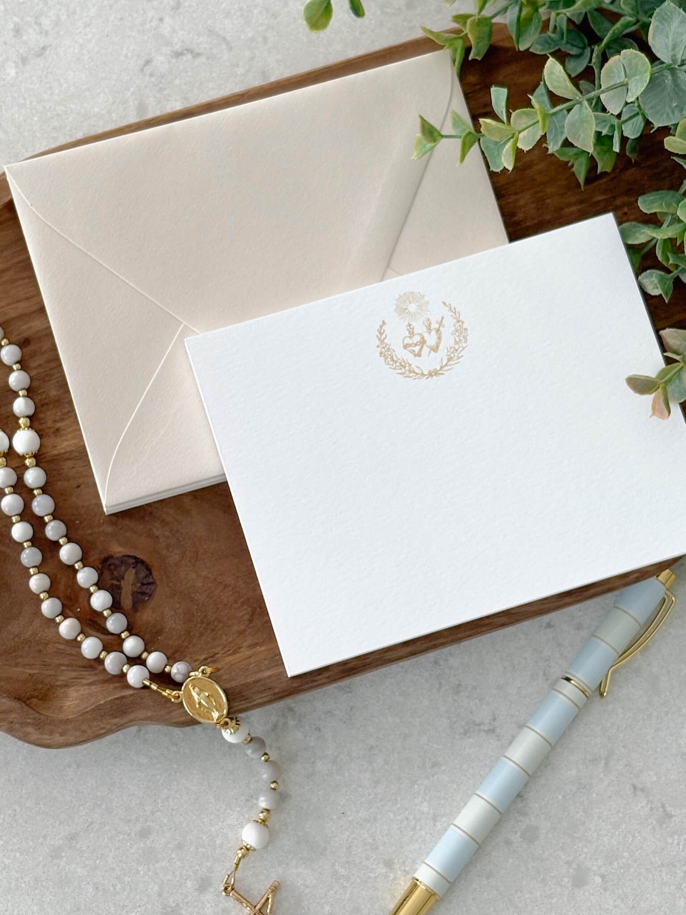 Paired with classic white euro-flap envelopes, this set of ten, beautifully designed by Pieta Paperie, is a meaningful and timeless way to honor these sacred devotions in your everyday correspondence.