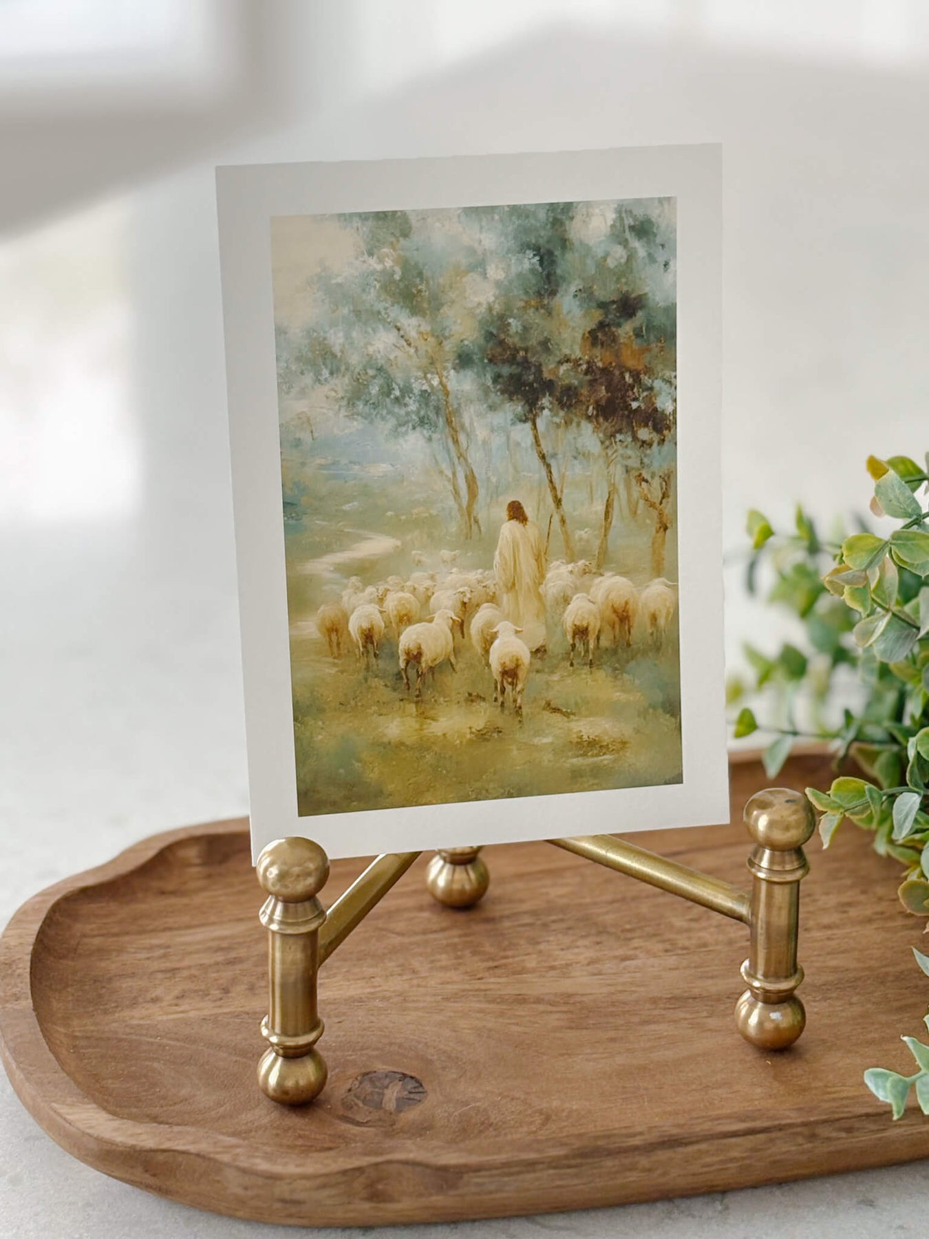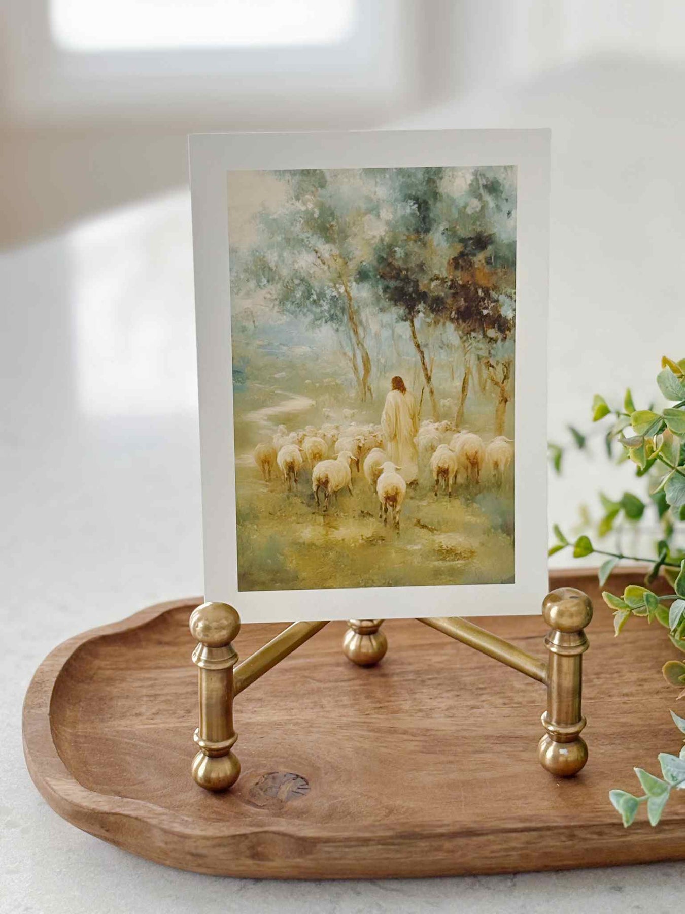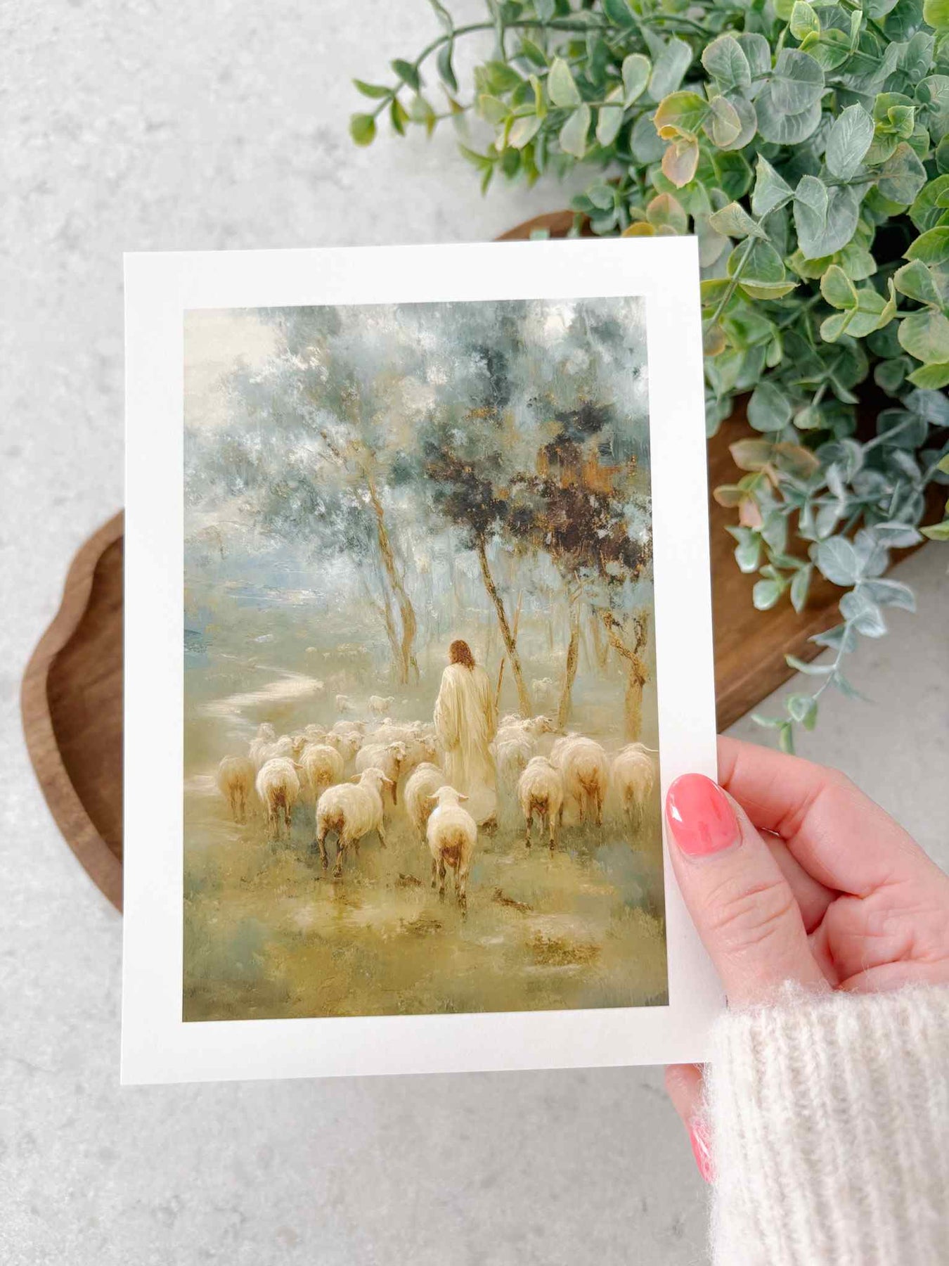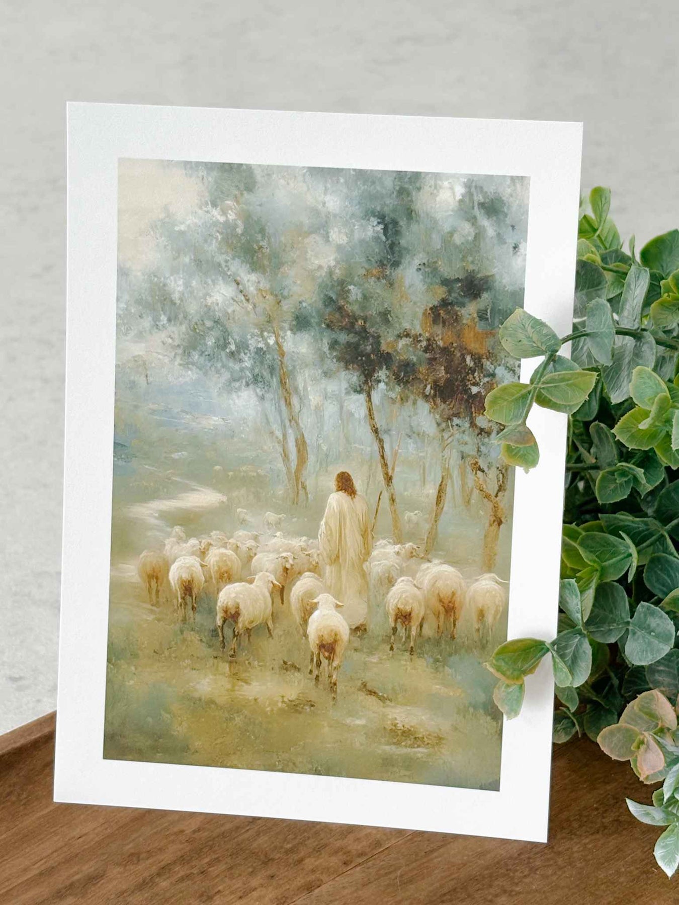 In Safe in His Care, Christ gently leads His flock through a quiet landscape washed in soft light and peace. The tender image draws us into the heart of the Good Shepherd, the One who knows His sheep, calls them by name, and guards them with unfailing love. The serene tones and gentle brushwork invite us to rest in the truth that we are never alone; we walk always beneath His watchful gaze.