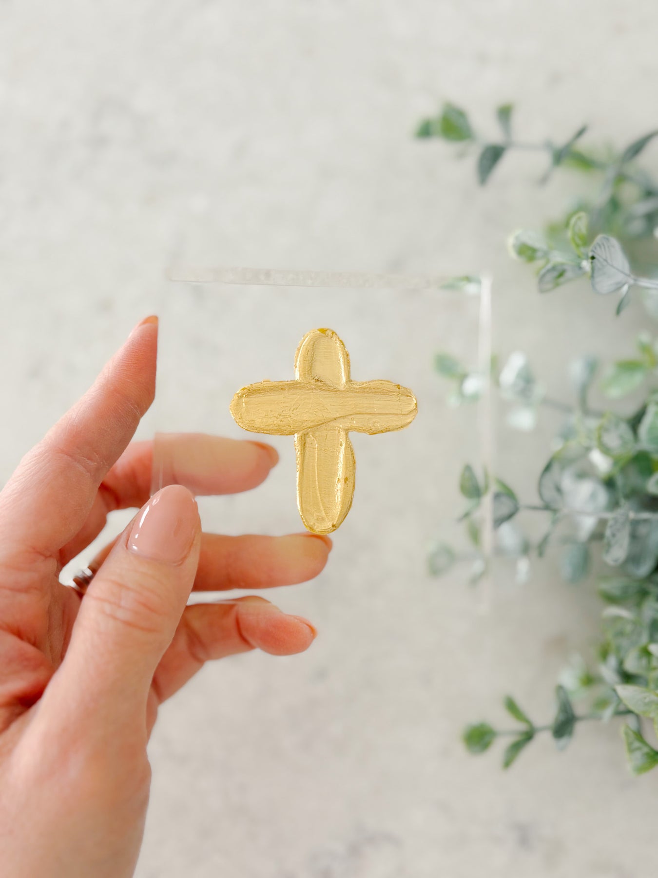 The transparent acrylic allows light to pass through, giving the hand-painted cross a subtle depth and presence. Its minimal design speaks quietly, yet meaningfully, inviting reflection on Christ’s sacrifice and the call to carry our own crosses with trust.