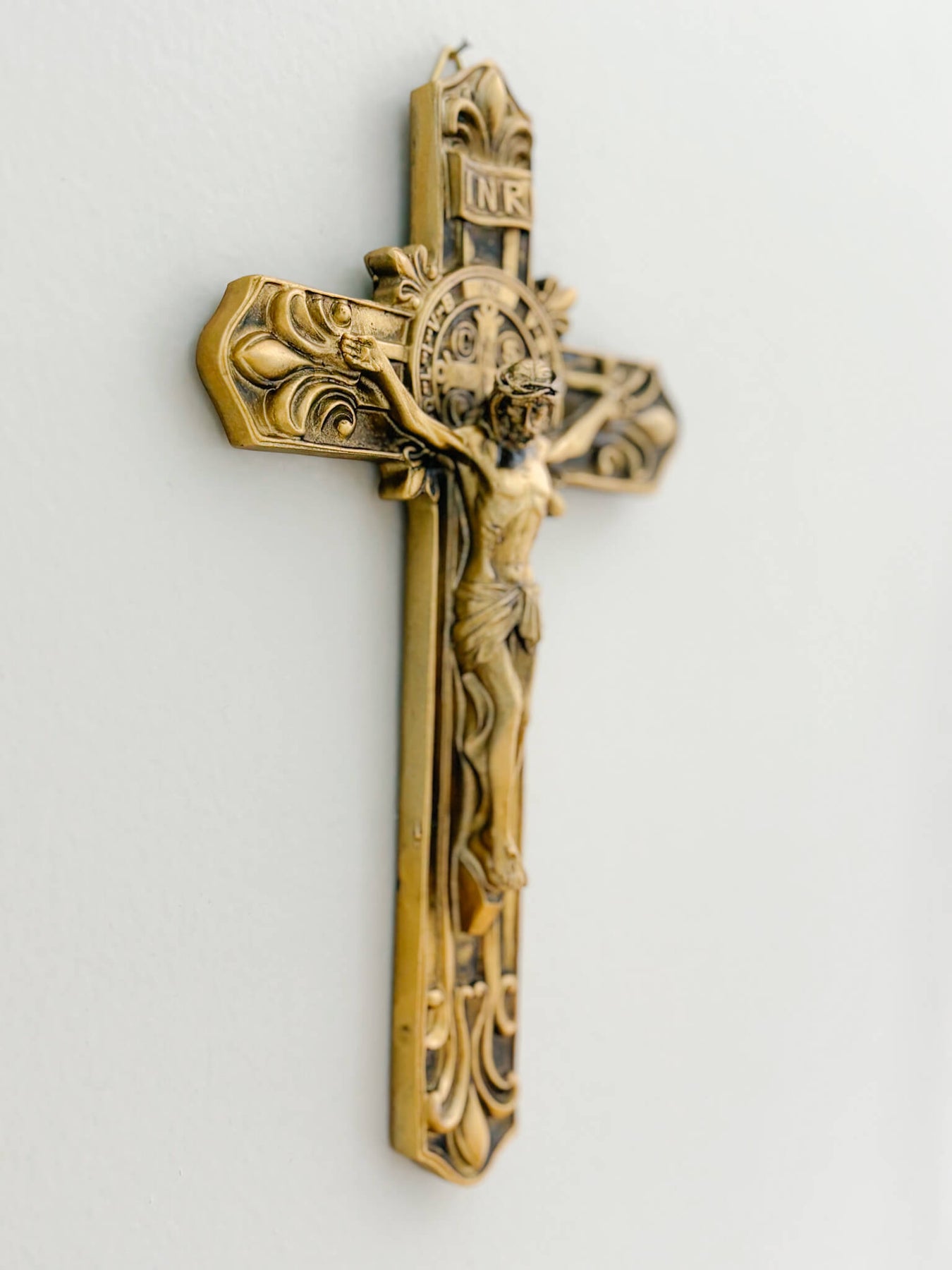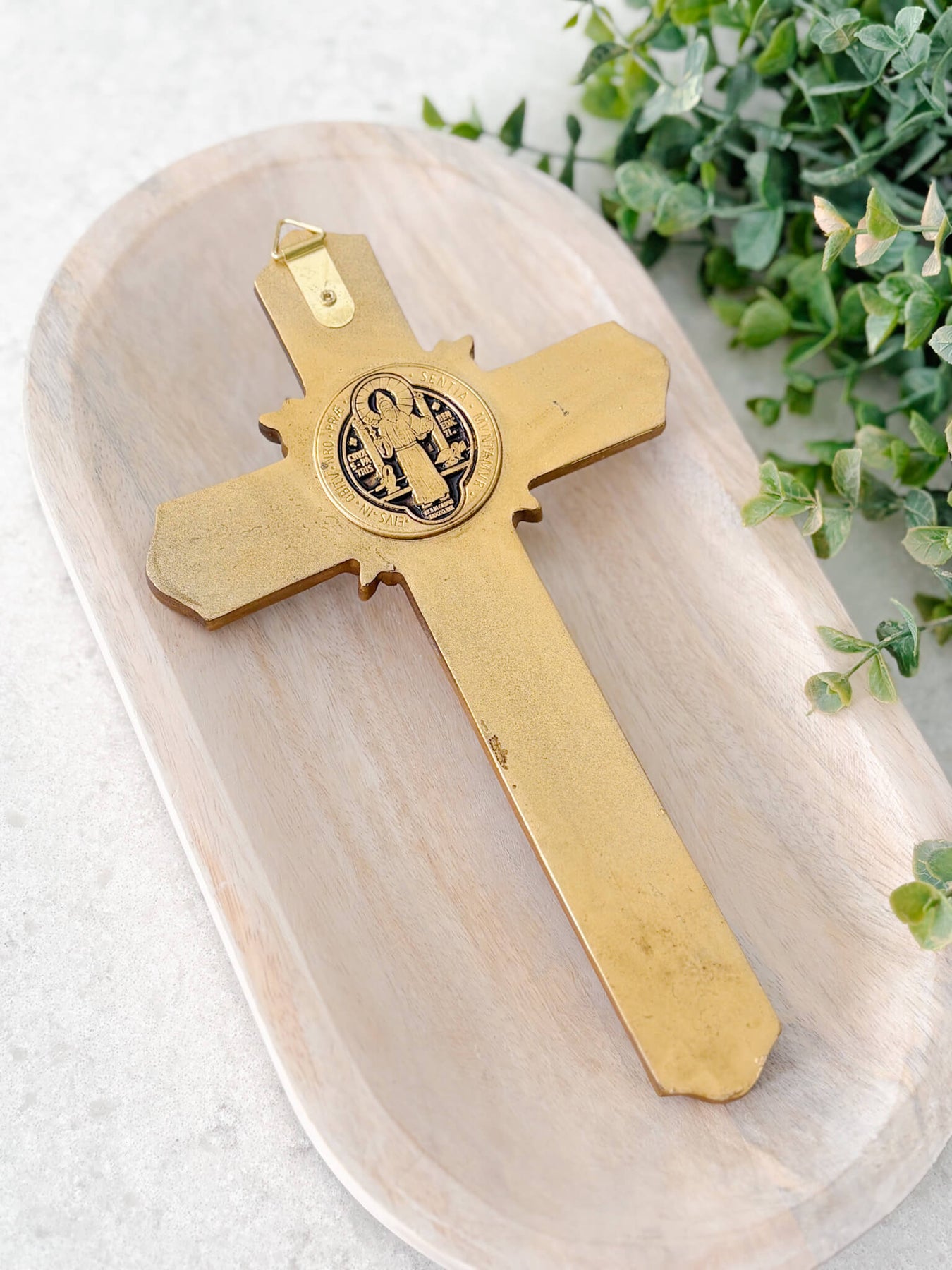 Our St. Benedict Crucifix – Gold beautifully unites the image of Christ crucified with the powerful St. Benedict Medal, a sacramental long associated with spiritual protection and strength in the face of evil. Finished in warm gold tones, with a vintage reproduction style, this piece brings both reverence and depth to any prayer space, bedroom, entryway, or office.