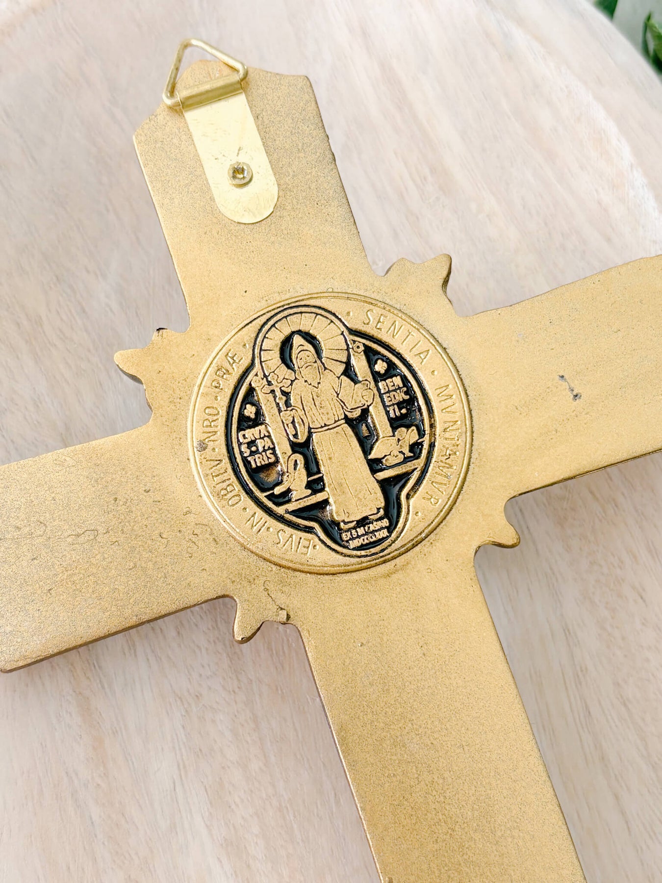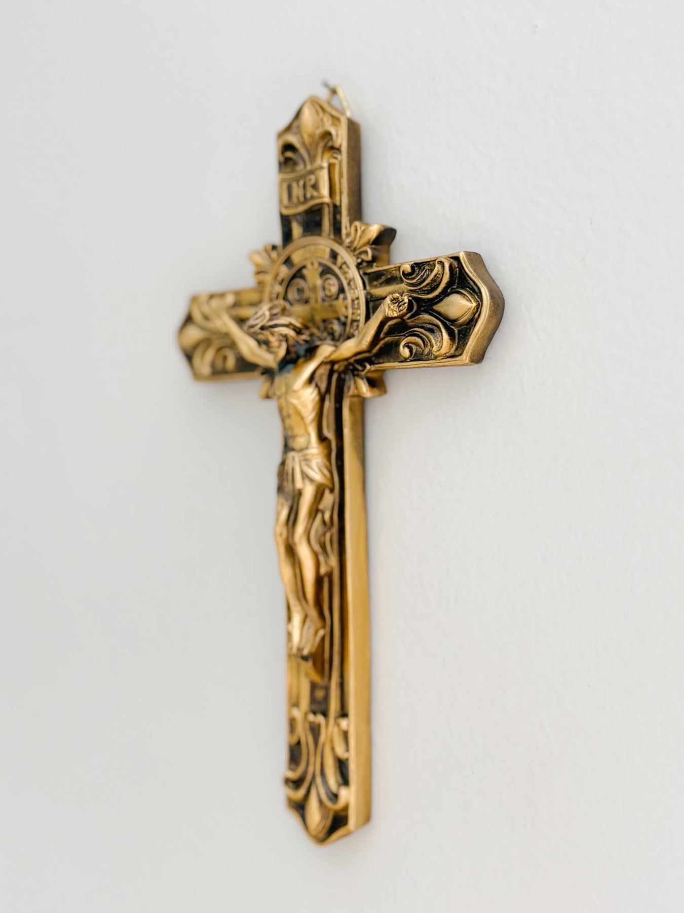 The detailed design highlights the crucified Christ alongside the medal’s intricate symbolism, creating a devotional piece that invites both contemplation and confidence in God’s safeguarding grace. Whether placed above a doorway, in a family prayer corner, or gifted to a loved one, this crucifix serves as a visible declaration of faith and trust in Christ.