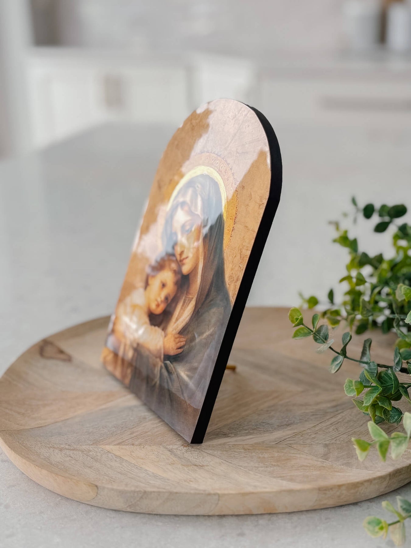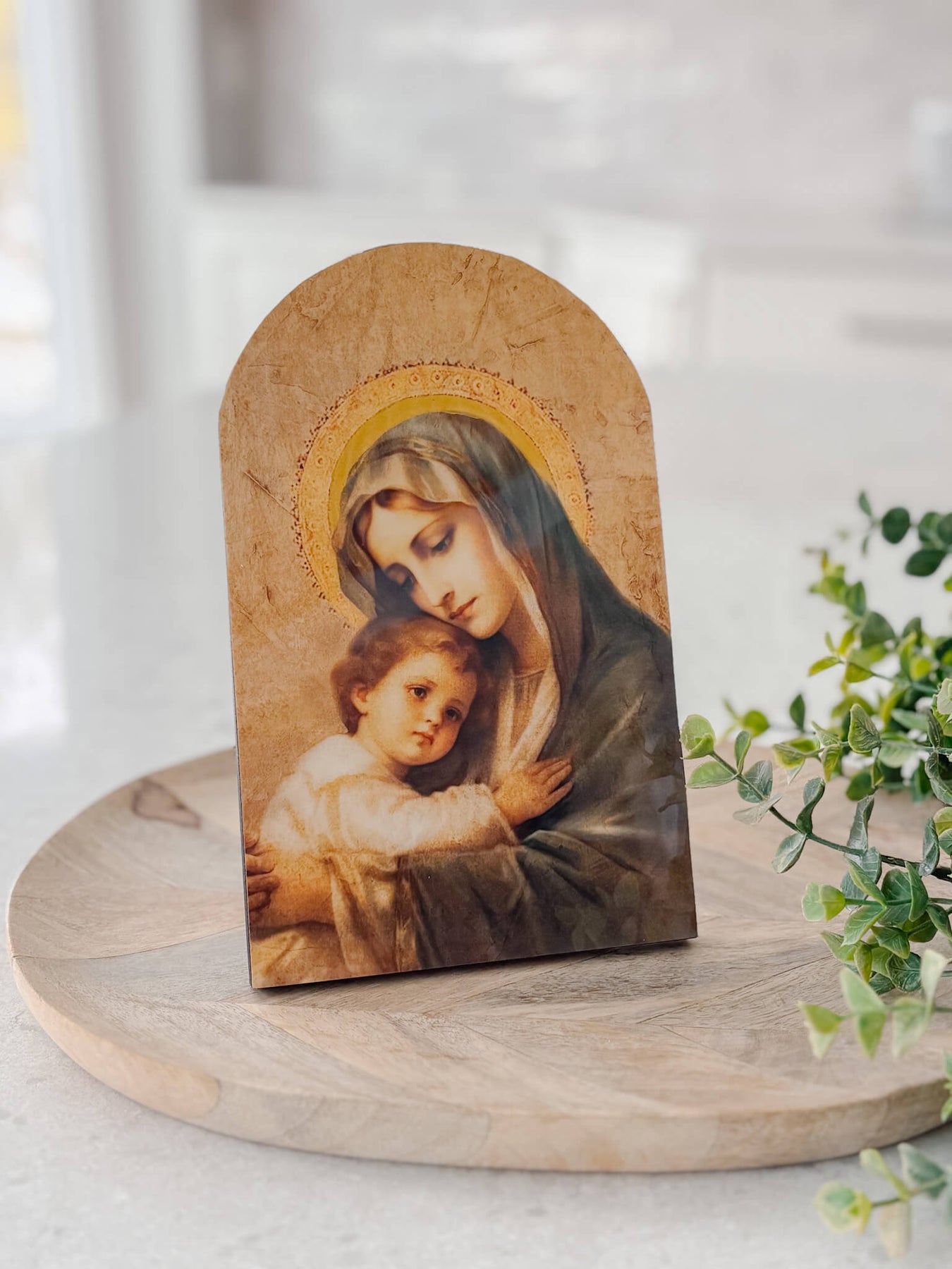 The Tender Madonna Arched Plaque features a luminous image of Our Lady gently embracing the Christ Child, rendered in rich gold tones that draw the eye and soften the heart. The warmth of the palette and the subtle radiance of the halo create a sense of divine light, inviting reverence, contemplation, and peace.