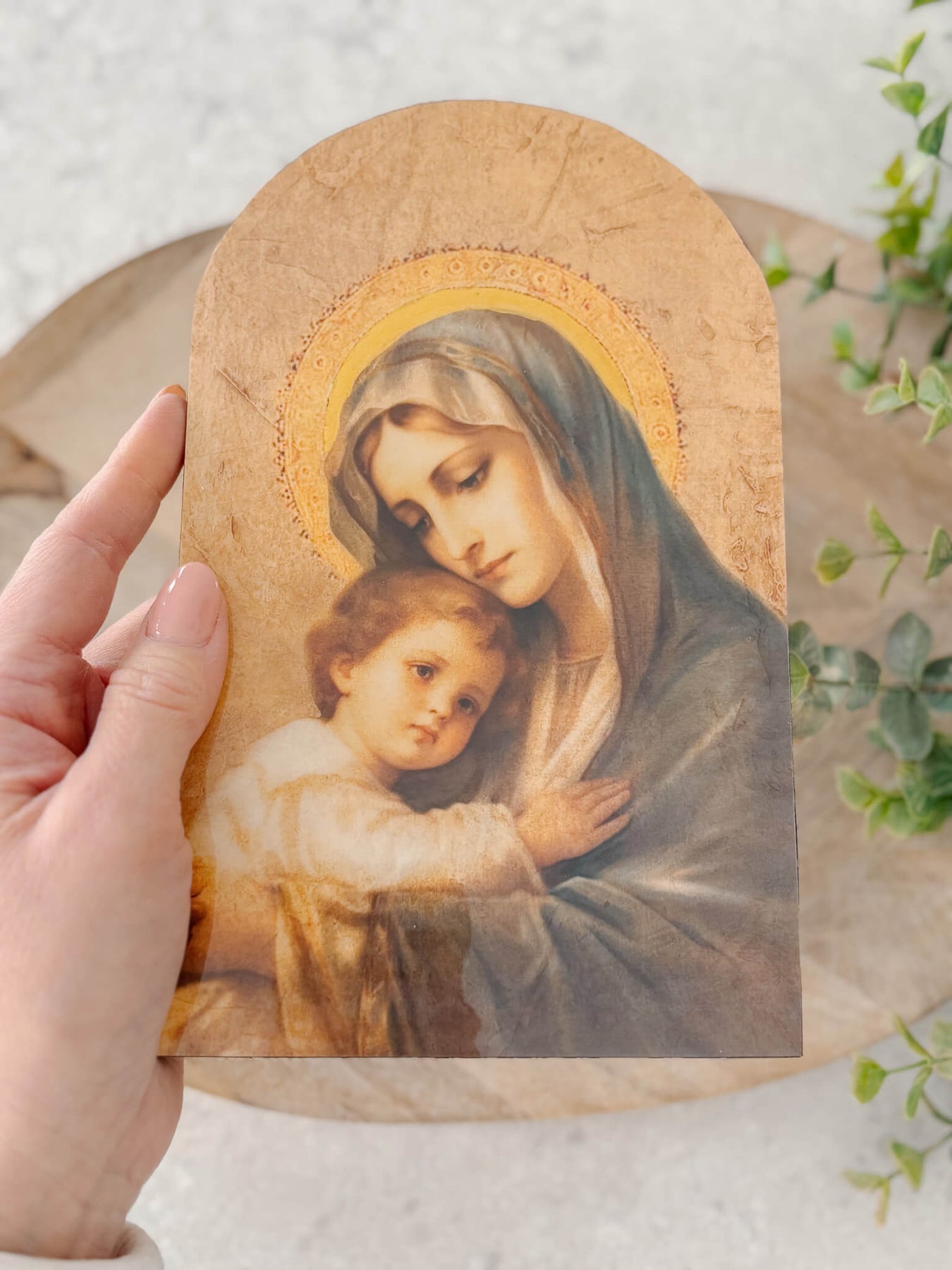 Shaped with a graceful arch, reminiscent of a chapel window or sacred niche, this plaque feels both timeless and intimate. It serves as a beautiful reminder of Mary’s maternal care and Christ’s nearness, making it a meaningful addition to a prayer corner, nursery, bedside table, or bookshelf.